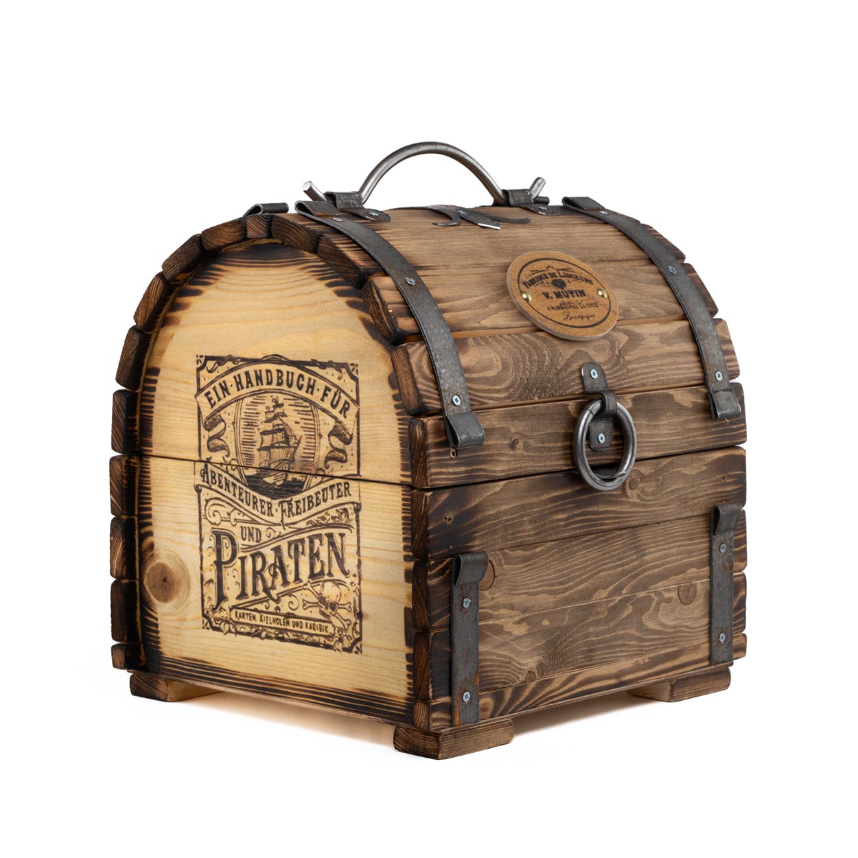 ✓ Бары-сундуки. На наш взгляд, идею создания подарочных мини-баров в форме сундуков следует признать поистине гениальной. Речь идёт о симпатичных сундучках, выполненных из натурального дерева, пропитанных льняным маслом, обработанных морилкой, стянутых лентами их нержавеющей стали), декорированных с применением технологии горячего клеймения. Внутри имеются гнёзда для двух бутылок/графинов и 6 стопок (последние входят в комплект, а графины вы сможете заказать у нас дополнительно по весьма демократичной цене). Сундук-бар станет желанным приобретением для организации уютного местечка для смакования любимых алкогольных напитков в «тёплой компании» близких людей в помещениях, оформленных в стилях «Этника», «Бохо», «Лофт». На крышке имеется удобная металлическая ручка, так что сундучок можно брать с собой на пикник, рыбалку, на дачу.