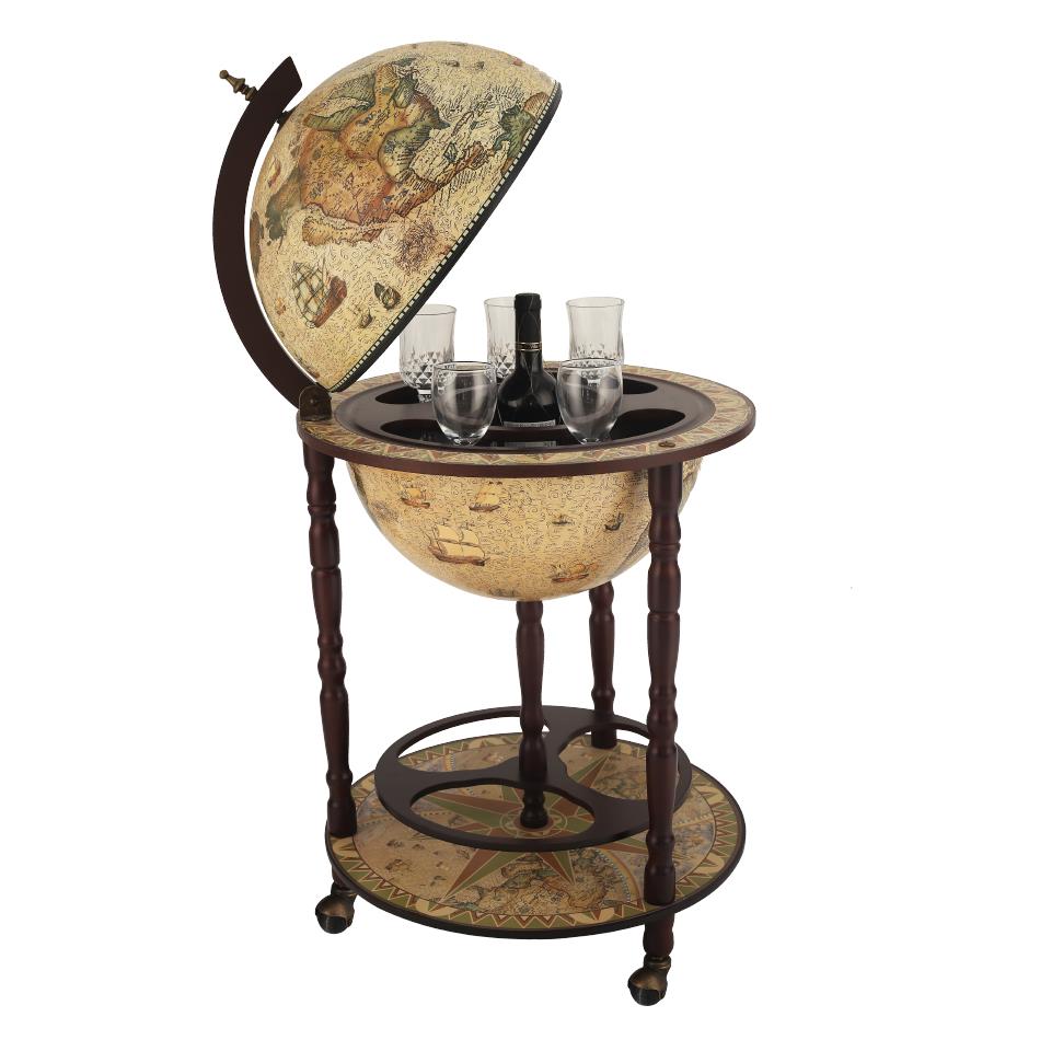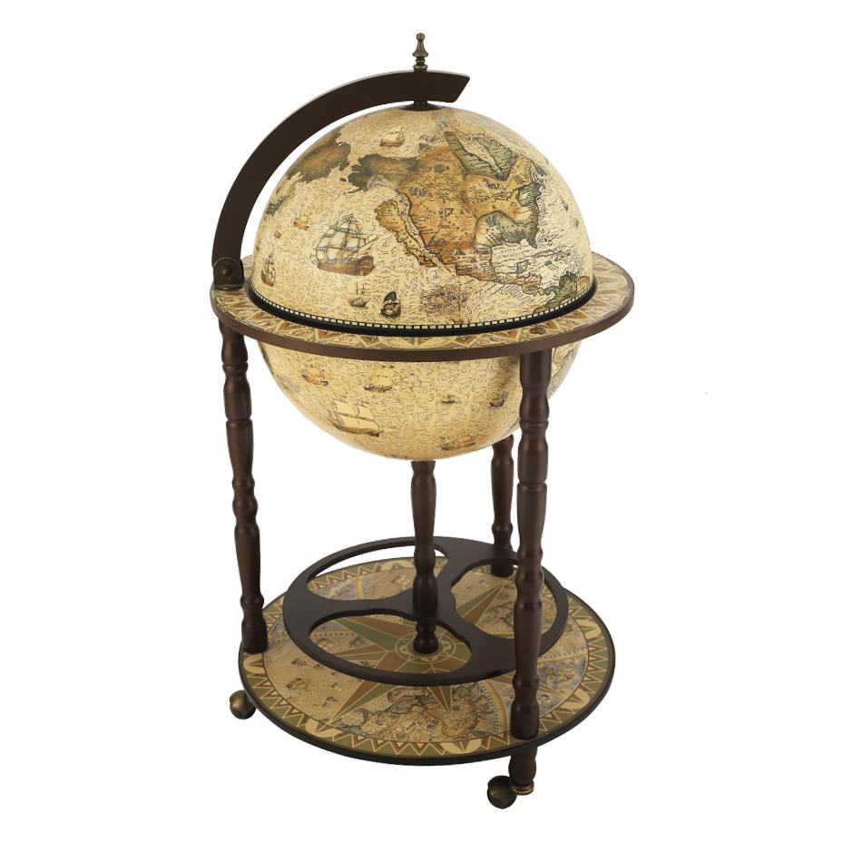 напольный глобус-бар выполнен в классическом стиле, а потому подойдет к убранству любого помещения, будь то гостиная, деловой кабинет, переговорная комната. Светлые тона не позволят предмету интерьера украсть значительную часть пространства;