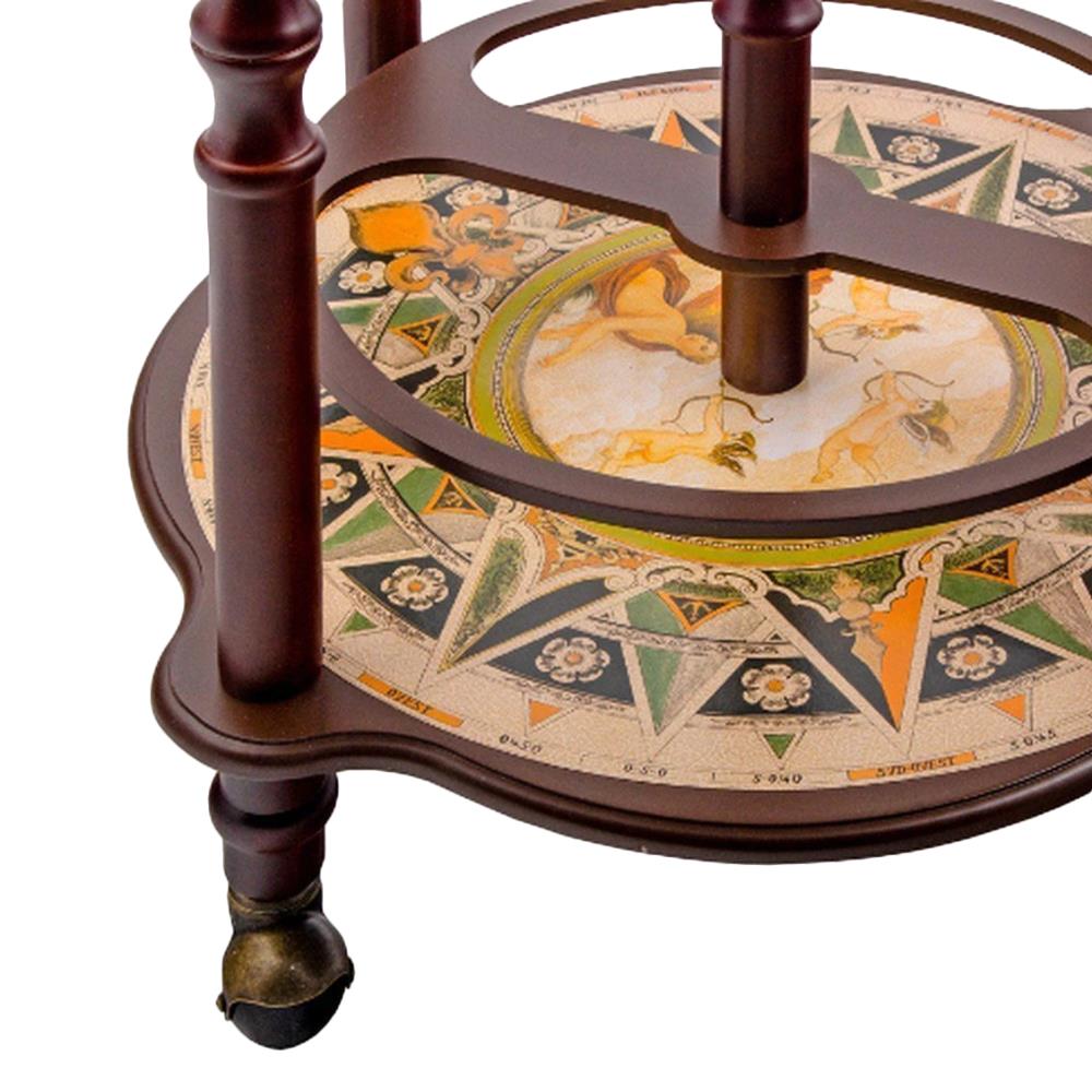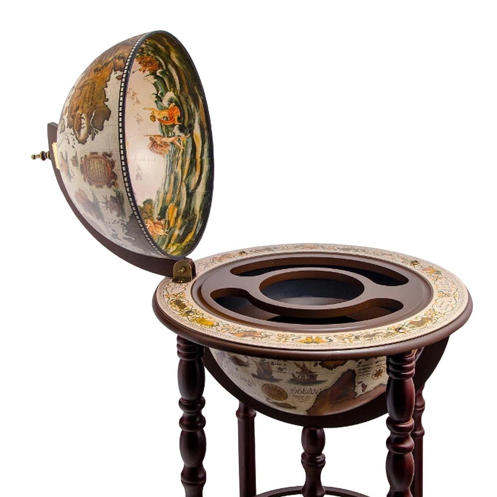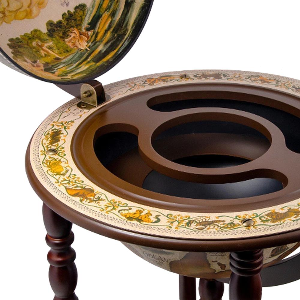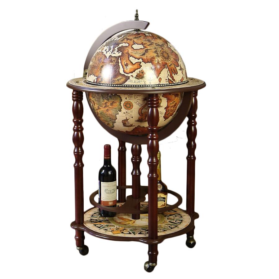 Устойчивость напольного глобуса-бара напрямую связана с основательными, при этом резными и очень красивыми, деревянными ножками, столиком-полкой и перемычкой, которые соединяют всю конструкцию воедино. На этой дополнительной полке также можно будет хранить несколько бутылок алкоголя, что говорит о том, что бар весьма вместителен.