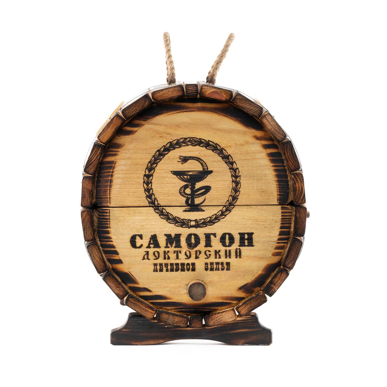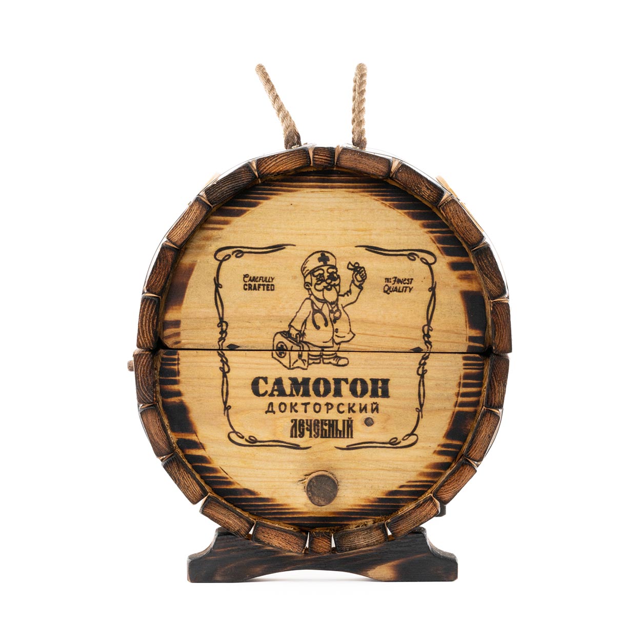 Стилистическая идея дизайна мини-бара «Докторский» базируется на изображениях медицинской тематики – чаше, обвитой змеёй и весёлом докторе Айболите. Такие рисунки нанесены на оба торца «праздничного бочонка» методом горячего клеймения. Изображения дополняются выполненными оригинальным шрифтом надписями «Самогон докторский», «Лечебный».