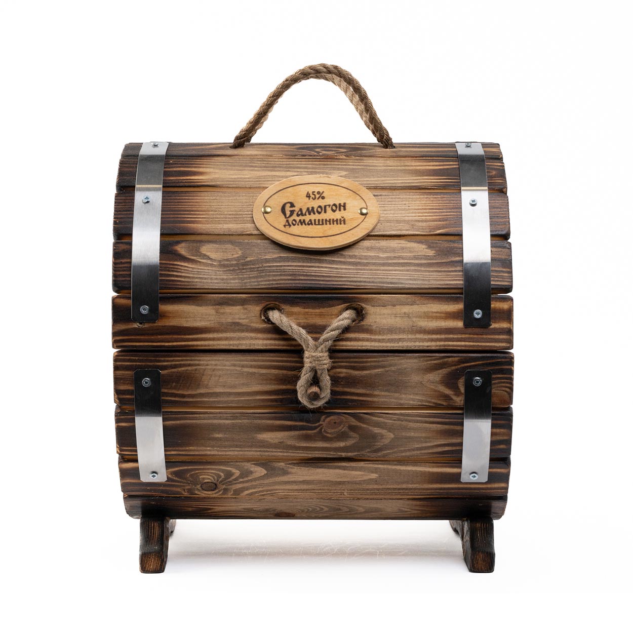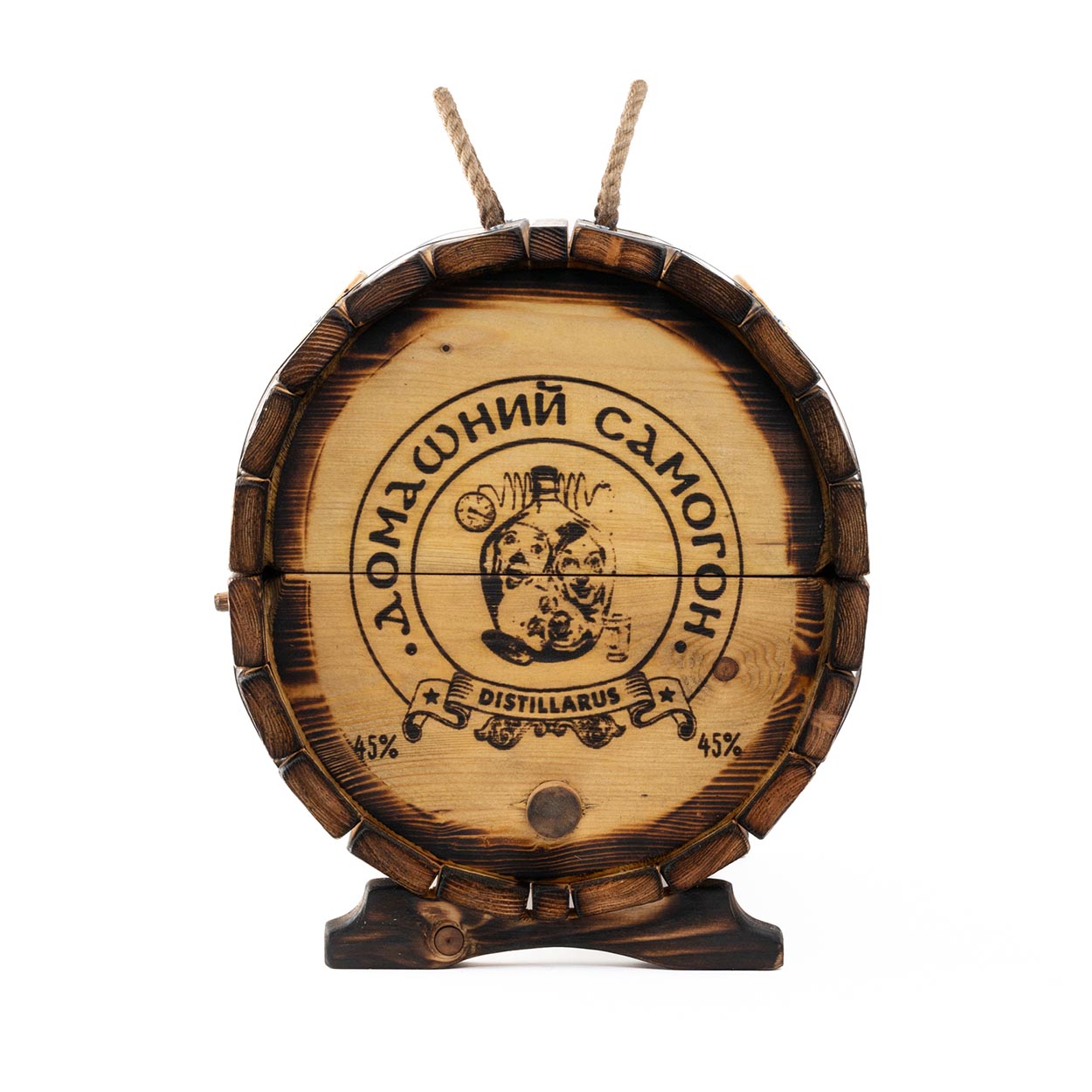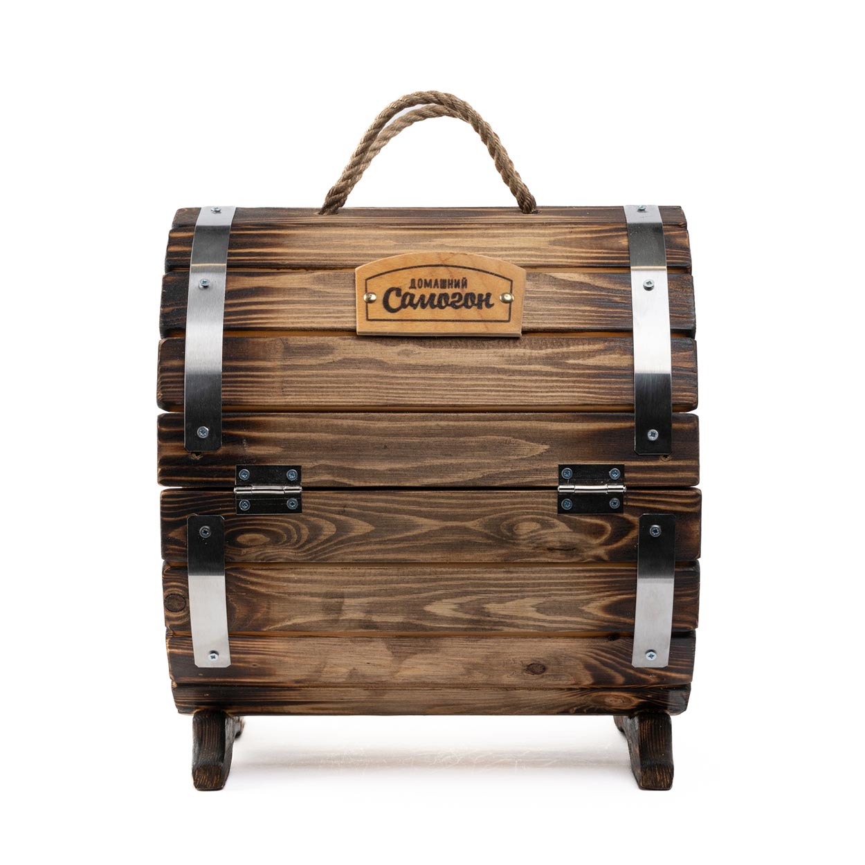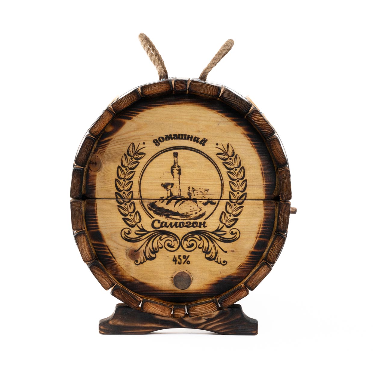 Стильный наружный дизайн мини-бара «Домашний» формируется за счет узнаваемых символов. На одном его торце методом горячего клеймения нанесен фрагмент домашнего застолья и надпись «Домашний самогон», а на другом - процесс приготовления главного деревенского напитка.