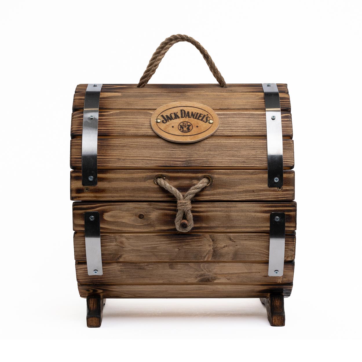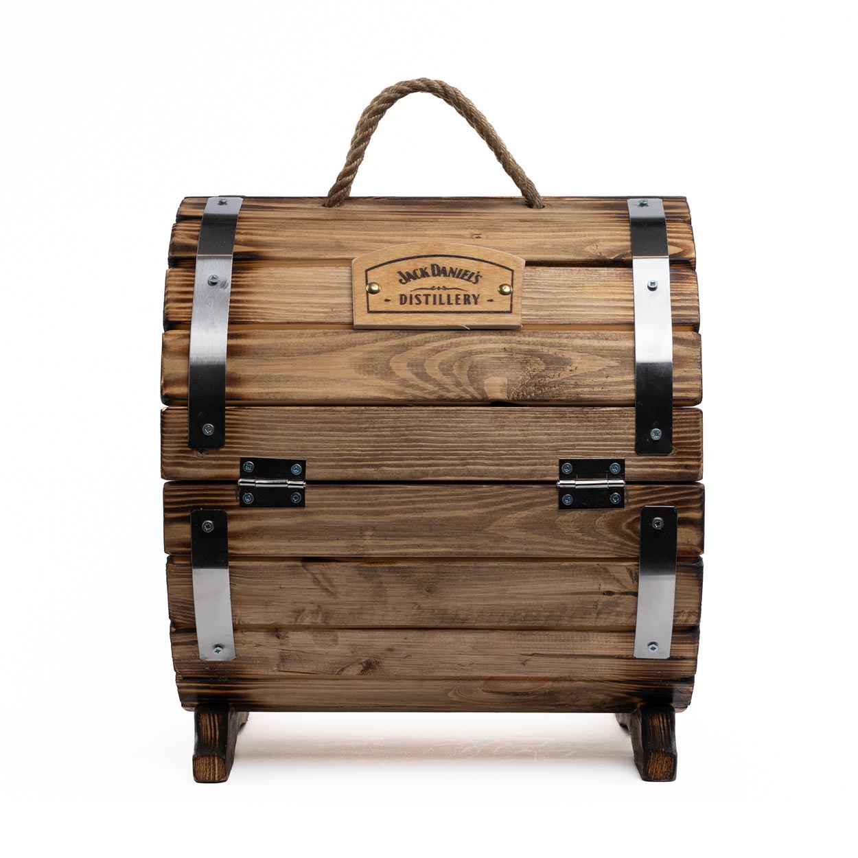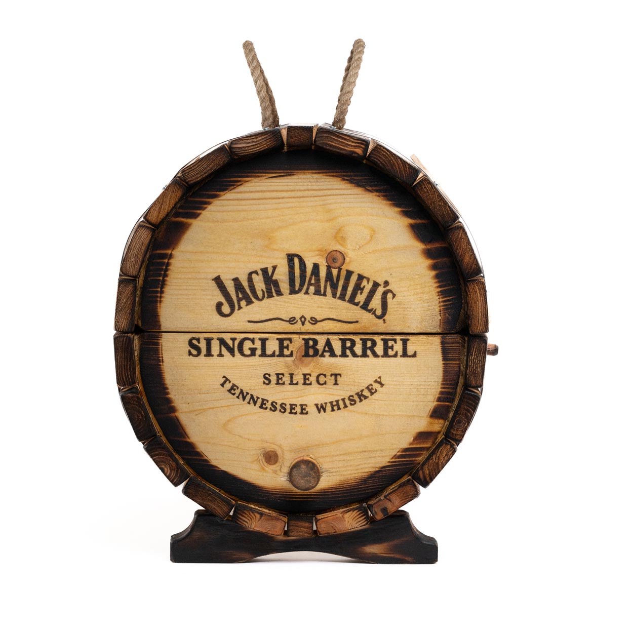 Стилистическая идея дизайна мини-бара «Jack Daniels» базируется на изображениях лейблов известных марок виски. Такие рисунки нанесены на оба торца «праздничного бочонка» методом горячего клеймения. Изображения дополняются выполненными оригинальным шрифтом надписями «Jack Daniels», «Single Barrel».