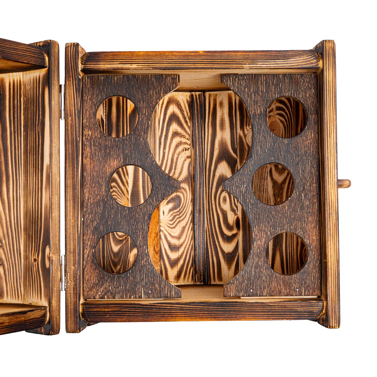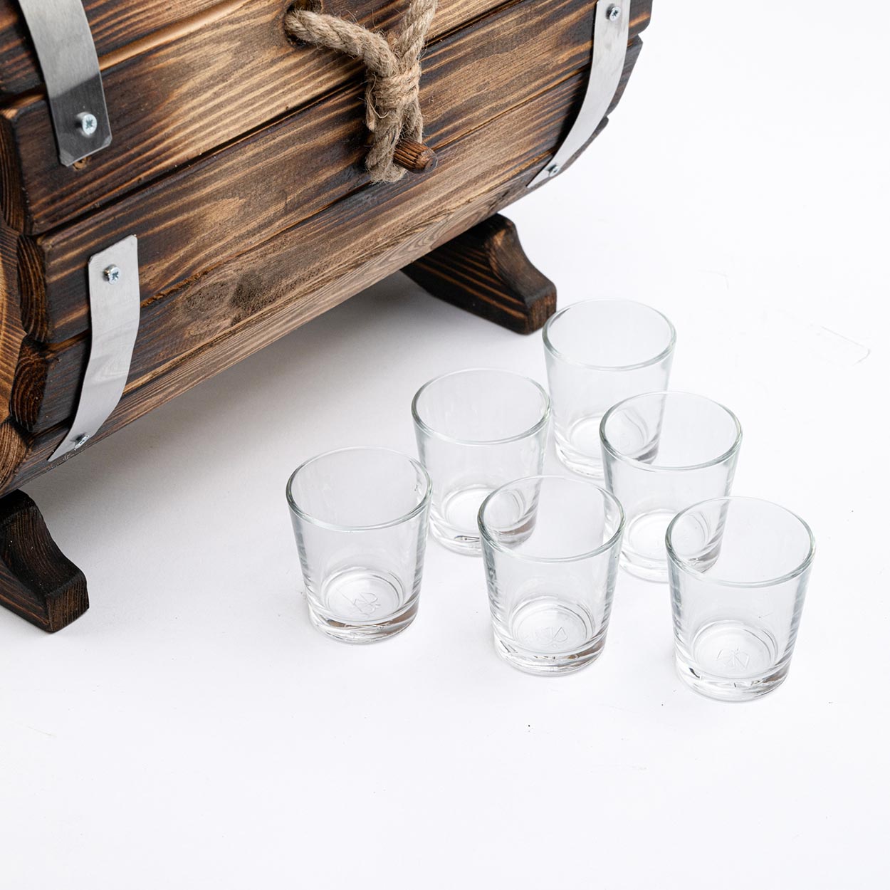 Внутри мини-бара под его откидывающейся верхней частью находится удобная подставка для шести стеклянных стопок, которые входят в его комплект. Стопки идеально подойдут для прочувствованной дегустации виски, водки, коньяка в кругу родных, друзей или коллег.