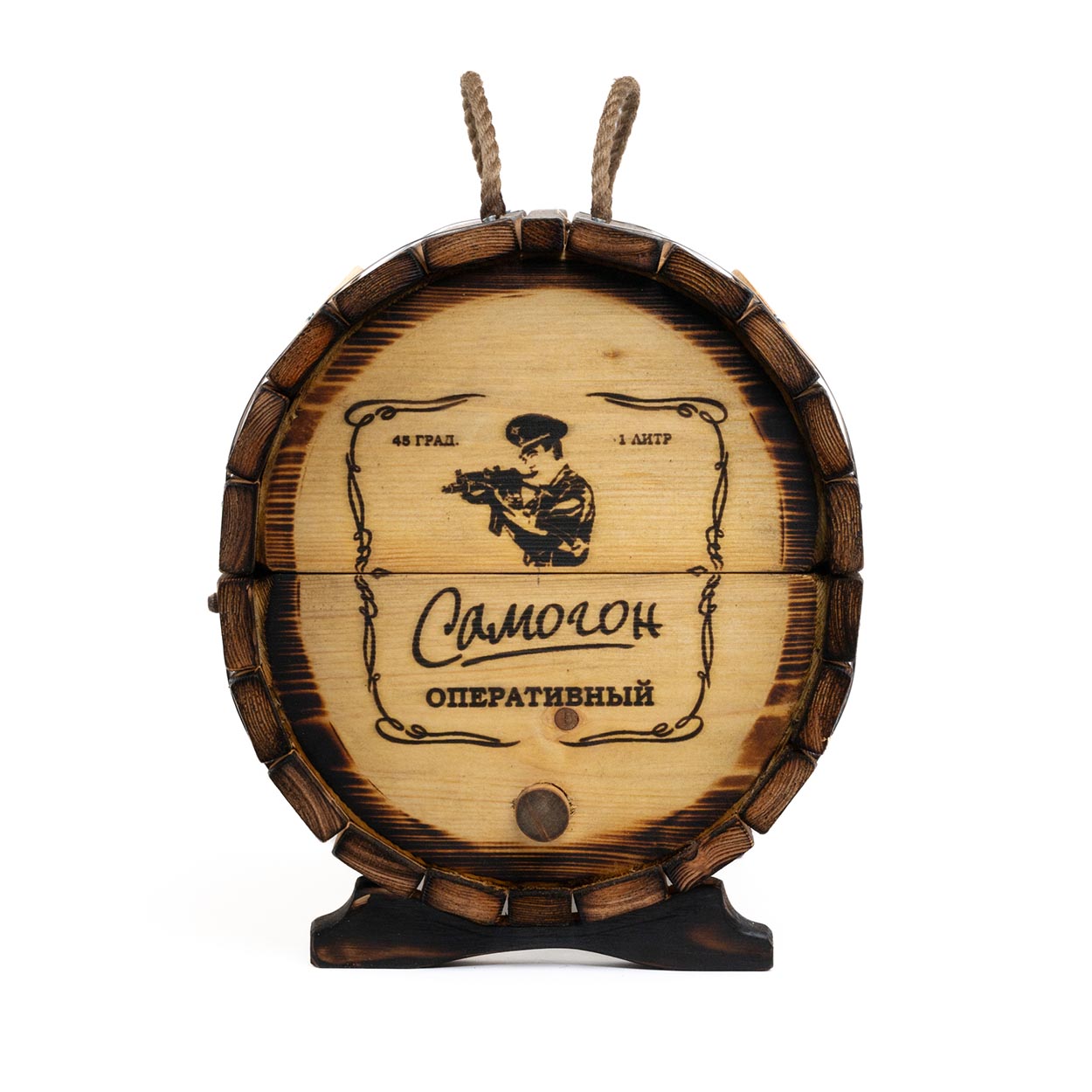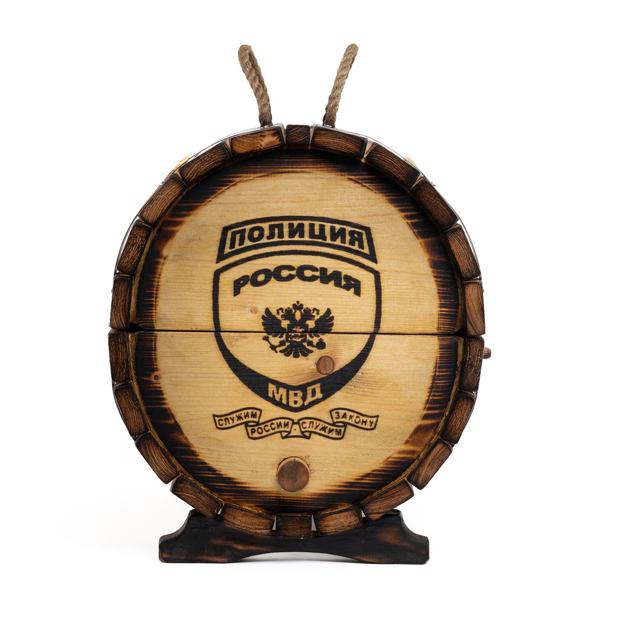 Стилистическая идея дизайна мини-бара «МВД» базируется на тематических изображениях: эмблеме ведомства и бесстрашного полицейского с автоматом в руках. Такие рисунки нанесены на оба торца «праздничного бочонка» методом горячего клеймения. Изображения дополняются выполненными оригинальным шрифтом надписями «Служим России - служим закону», «Самогон оперативный».