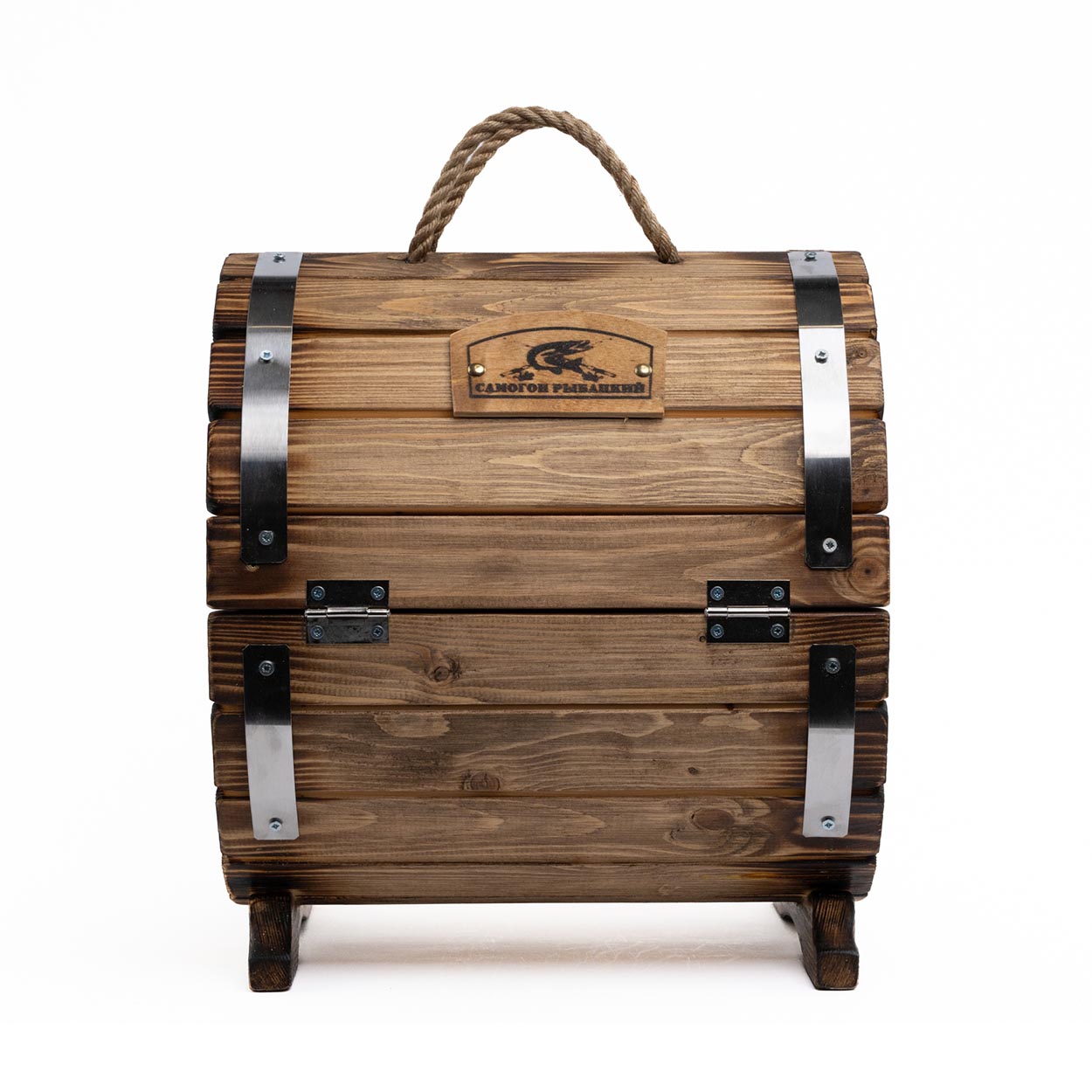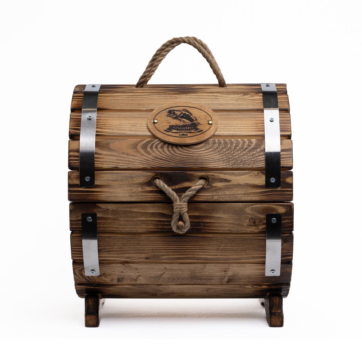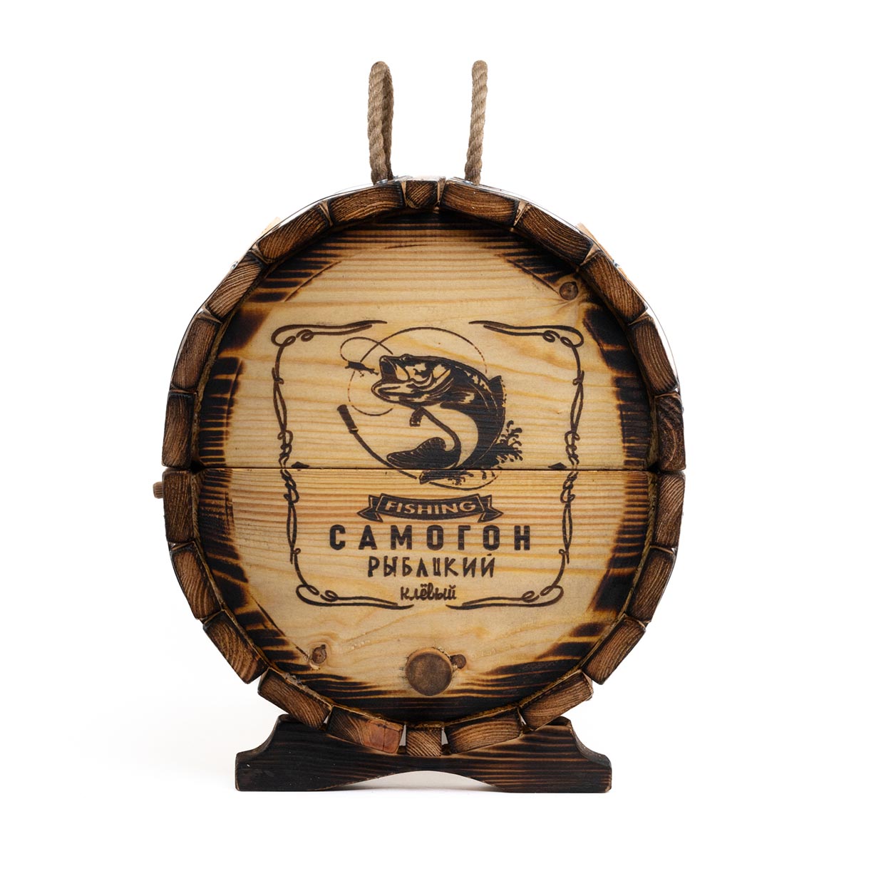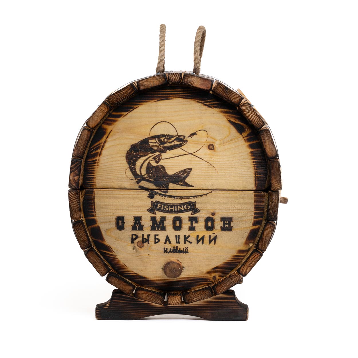 Уникальный декоративный дизайн мини-бара «Рыбацкий», наверняка, придется по душе любителям посидеть с удочкой на берегу озера или реки и затем отметить улов наваристой ухой в сопровождении веселящего душу «огненного зелья». На торцах дизайнерского бочонка изображены картины рыбной ловли, дополненные колоритными надписями «Самогонъ Рыбацкий» и «На чистейшей воде».