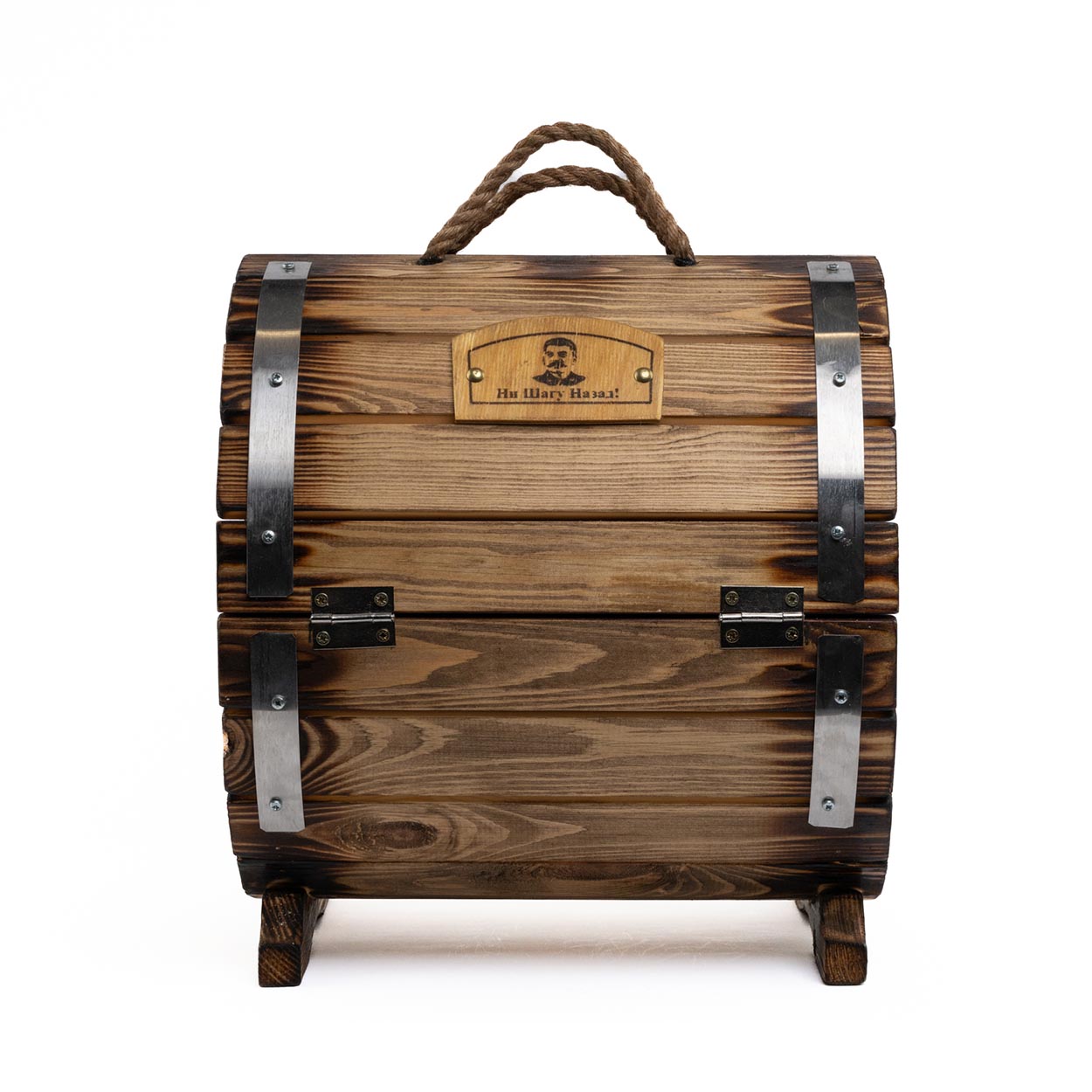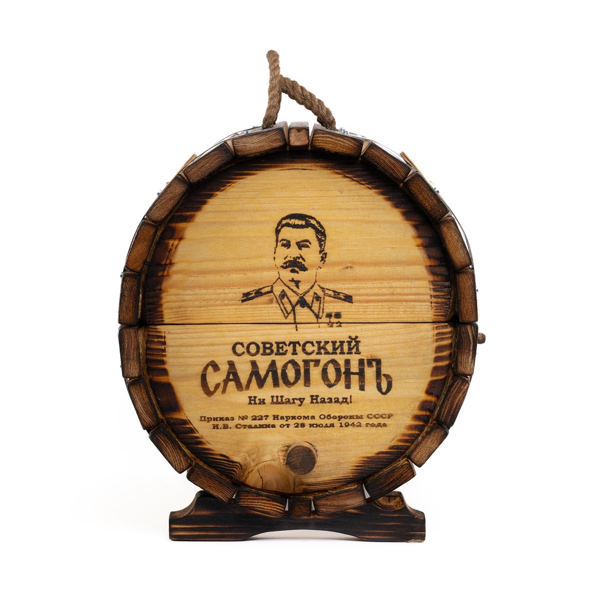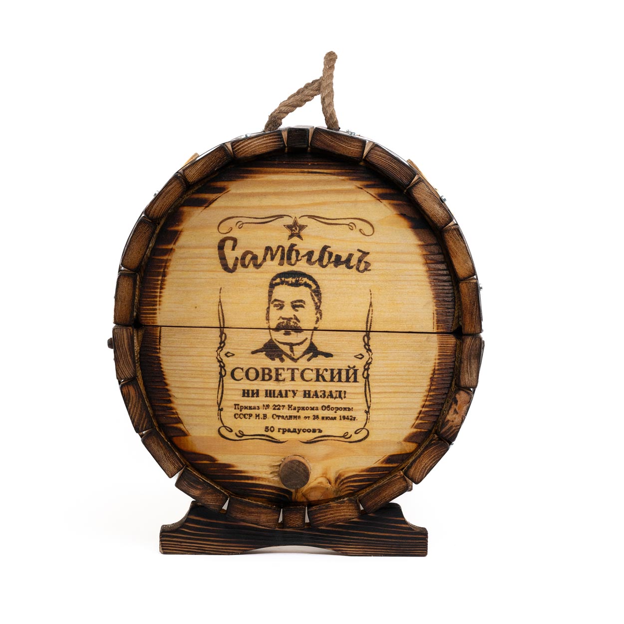 Харизматичный дизайн мини-бара «Сталинский» основан на портретах всемирно известного лидера советской эпохи, нанесенных на оба торца «праздничного бочонка». Портрет колоритно дополняется надписями «1/20 ведра», «Самогонъ», «Ни шагу назад», «50 градусовъ» и другими. Благодаря этому задается атмосфера соответствующей исторической эпохи.