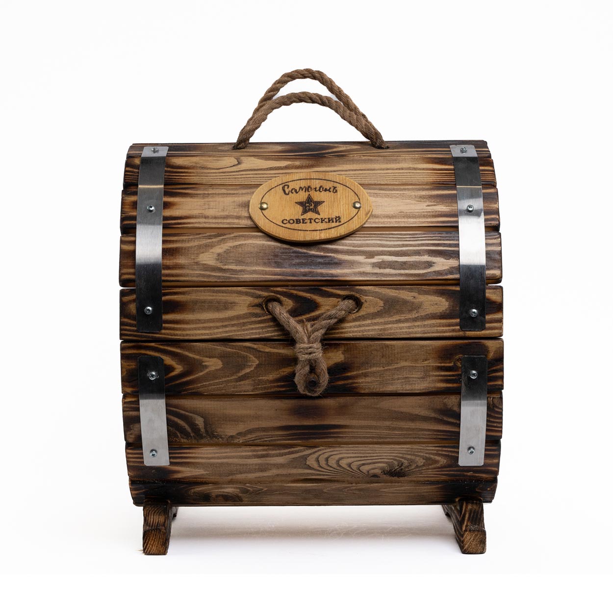 Уникальный мини-бар «Сталинский» – это подлинное произведение высокого декоративного искусства. Для его изготовления была использована натуральная экологически чистая древесина - сосна. Собранные в единое изделие деревянные дощечки прошли пропитку льняным маслом и сложную обработку методом обжига. Затем они были покрыты морилкой, эффектно подчеркнувшей их индивидуальный рисунок годовых колец. На последнем этапе дощечки были защищены от внешних повреждений слоем лака и стянуты лентами нержавеющей стали.
