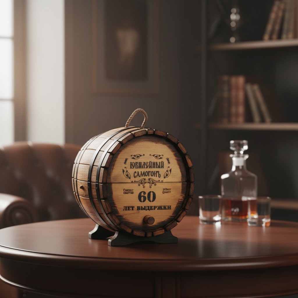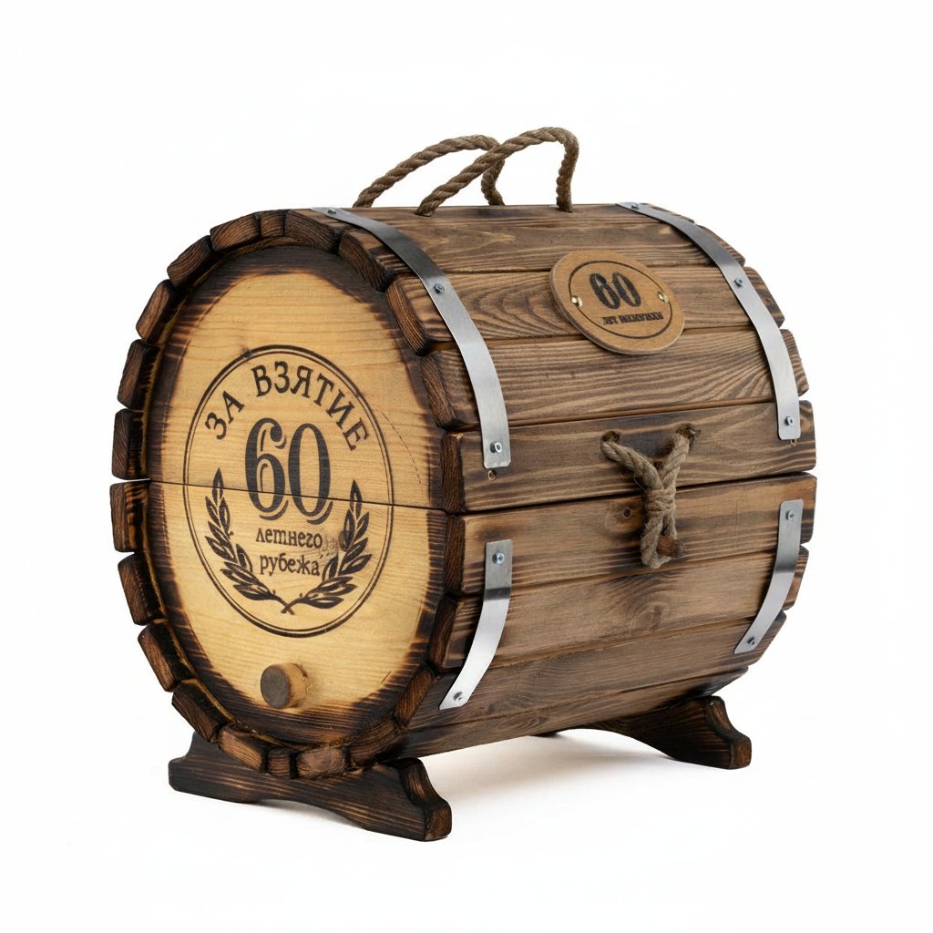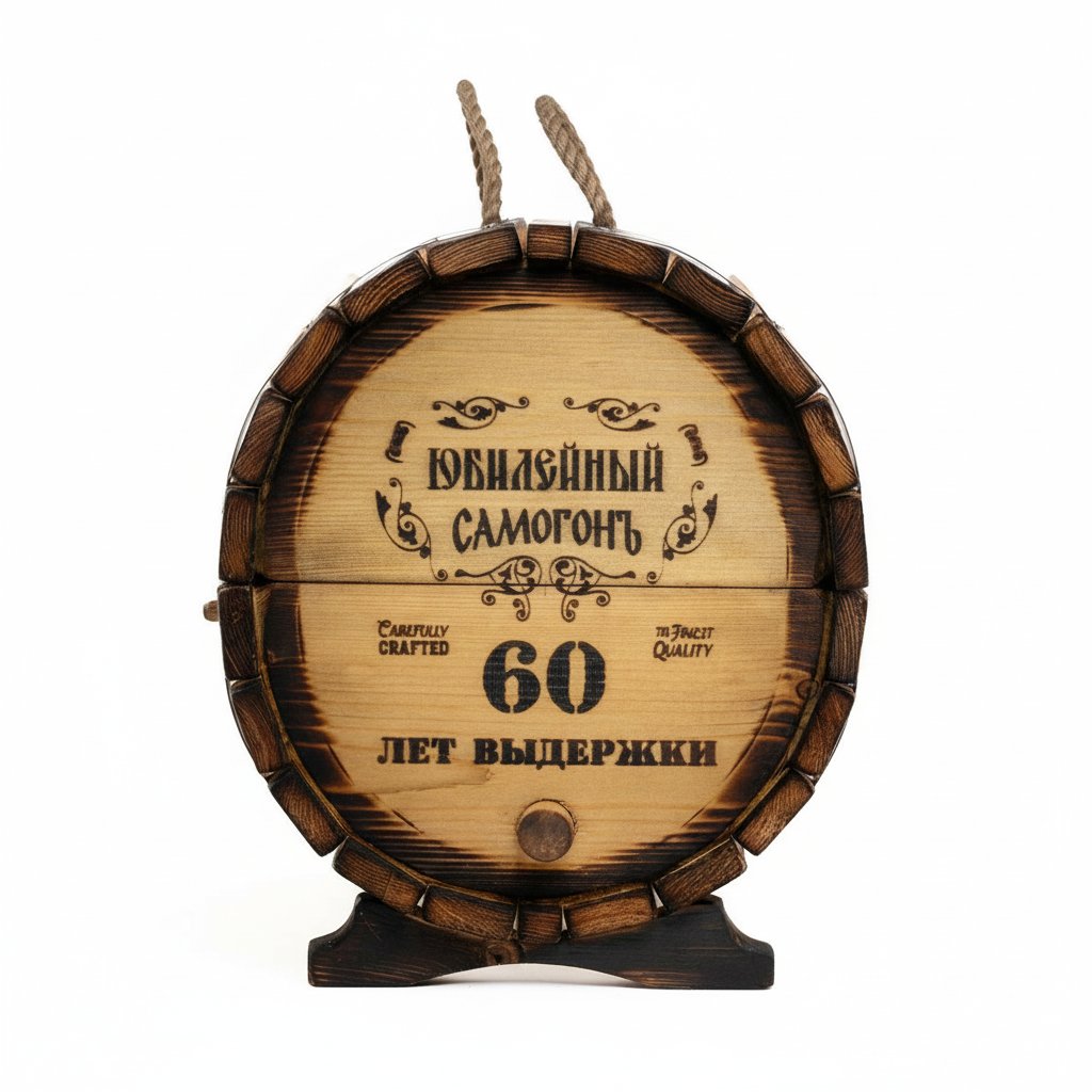 Стилистическая идея дизайна мини-бара «Юбилейный - 60 лет» базируется с одной стороны на изображении ордена, где указан возраст юбиляра, а с другой - длительность выдержки, которая также зависит от того, какой юбилей планируется отметить. Такие рисунки нанесены на оба торца «праздничного бочонка» методом горячего клеймения. Изображения дополняются выполненными оригинальным шрифтом надписью «Юбилейный самогон».