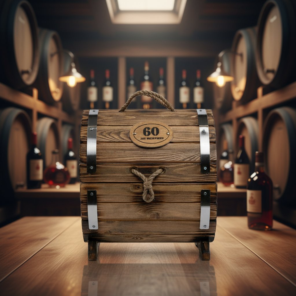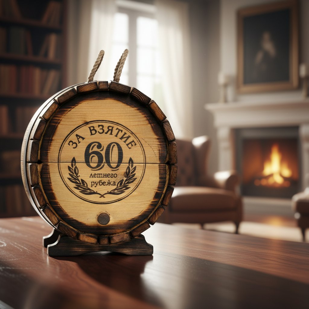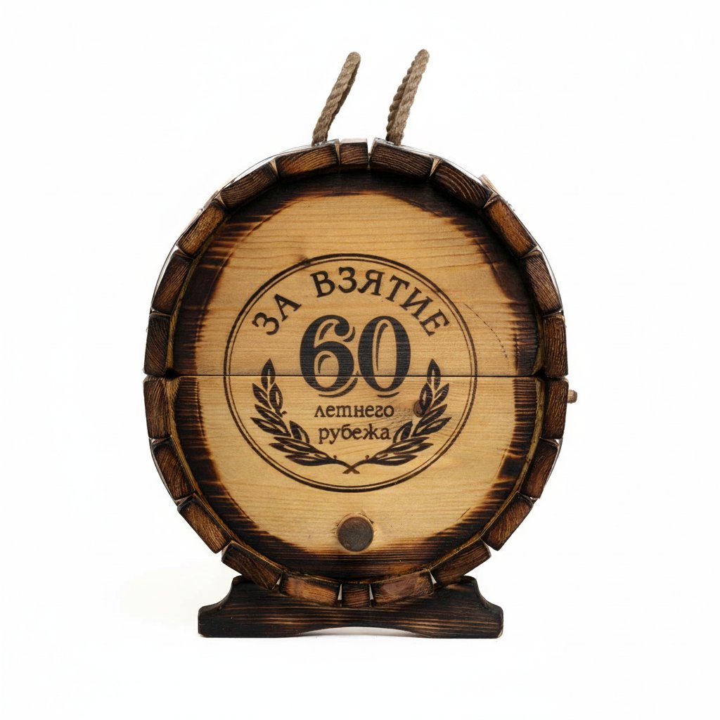 Стилистическая идея дизайна мини-бара «Юбилейный - 60 лет» базируется с одной стороны на изображении ордена, где указан возраст юбиляра, а с другой - длительность выдержки, которая также зависит от того, какой юбилей планируется отметить. Такие рисунки нанесены на оба торца «праздничного бочонка» методом горячего клеймения. Изображения дополняются выполненными оригинальным шрифтом надписью «Юбилейный самогон».