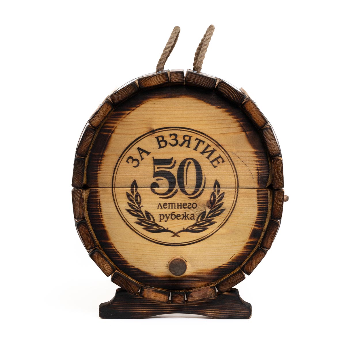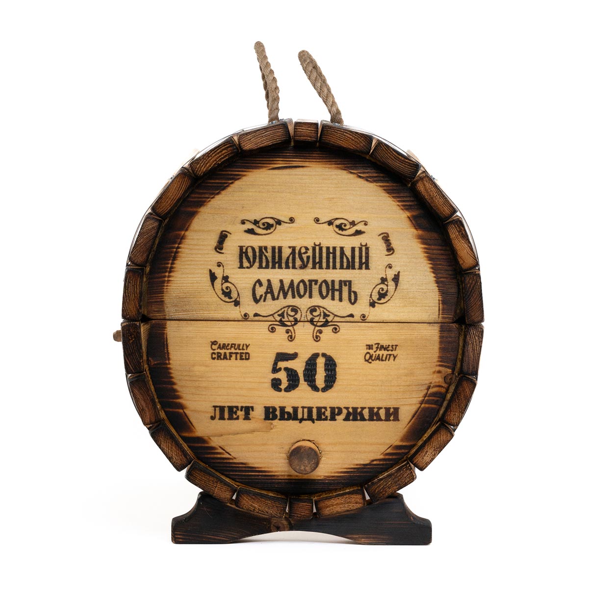 Стилистическая идея дизайна мини-бара «Юбилейный» базируется с одной стороны на изображении ордена, где вы можете самостоятельно выбрать и указать при оформлении возраст юбиляра, а с другой - длительность выдержки, которая также может изменяться в зависимости от того, какой юбилей планируется отметить. Такие рисунки нанесены на оба торца «праздничного бочонка» методом горячего клеймения. Изображения дополняются выполненными оригинальным шрифтом надписью «Юбилейный самогон».
