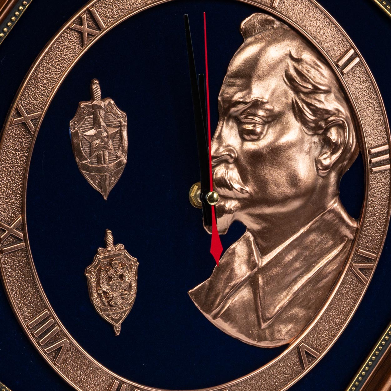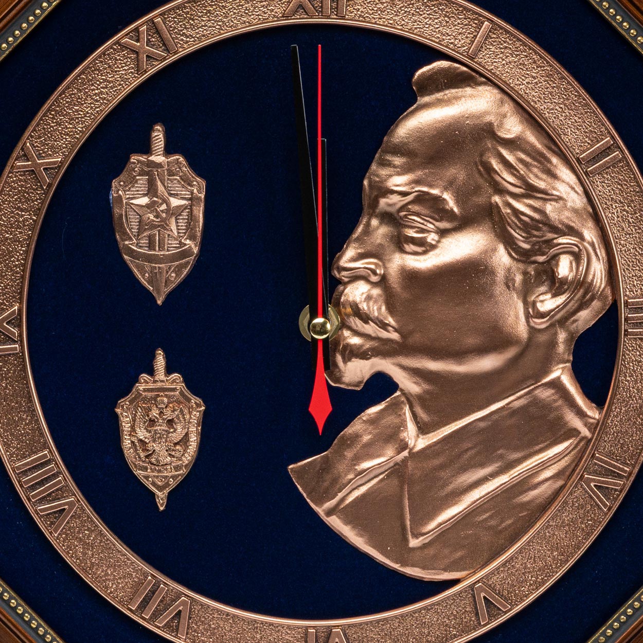 Внутри рамы находится колоритная темно-синяя подложка – паспарту. На ее фоне расположился циферблат часов с контрастной часовой стрелкой красного цвета. Циферблат выполнен из металлического сплава методом гальванопластики. В его правой части создатели часов поместили рельефный портрет Феликса Дзержинского, а левую украсили гербами КГБ и ФСБ.