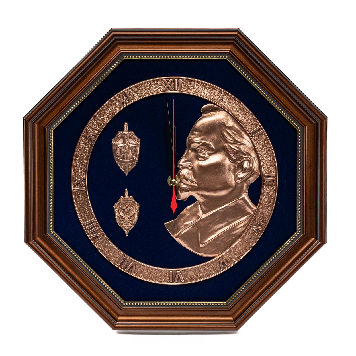 Настенные часы «Феликс Дзержинский» придутся по душе тем, кто изо дня в день охраняет наш покой и принимает прямое участие в защите страны от происков наших зарубежных недоброжелателей. Их наружный контур составляет восьмиугольная рама, изготовленная из прочного и стильного пластика. Окрас пластикового багета выполнен под темную древесину ценных пород. Внутренний бордюр рамы облагорожен золотым напылением.