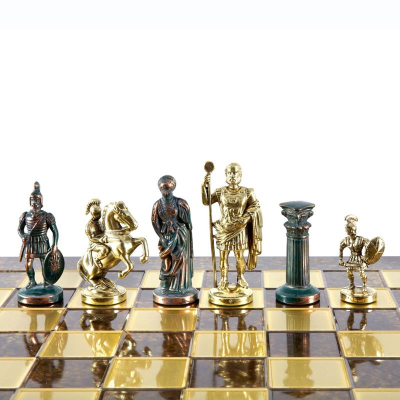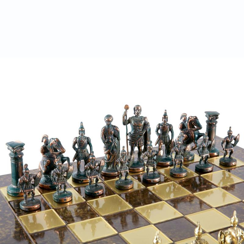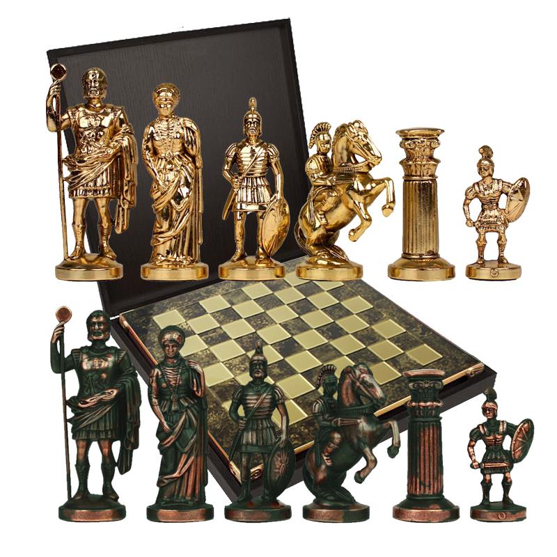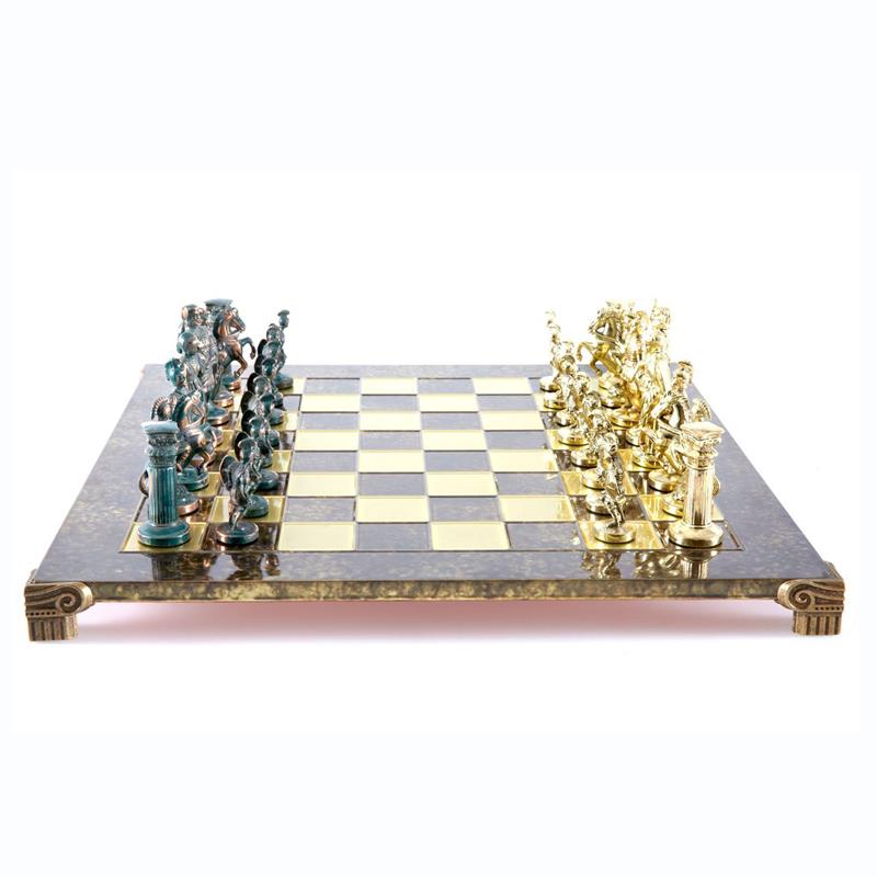 Рекомендованный набор непременно понравится любителю истории, поскольку переносит в античные времена, в период греко-персидских войн, когда отважные рыцари сражались за свои земли. Здесь все шахматные фигуры выполнены в виде миниатюрных статуэток, с четкой детализацией и прорисовкой элементов одежды, доспехов. Одариваемый будет бесконечно любоваться каждой складочкой греческих нарядов и восторгаться тонкой ювелирной работой. А ведь ее можно назвать таковой, потому как фигуры изготовлены из специального цинкового сплава «замак», что широко используют в ювелирном деле. Он прочный как сталь. В нем отсутствуют вредные для человека вещества, а потому набор чист и безопасен, и пользоваться им могут даже совсем юные игроки. Особенно хочется отметить цвет фигур: часть из них в золоте, а вторая имеет эффект антик — напыление в антикварном стиле, которое определенно, придает им шарм. Латунное покрытие и ручная полировка фигур привлекают к ним внимание блеском и лоском.