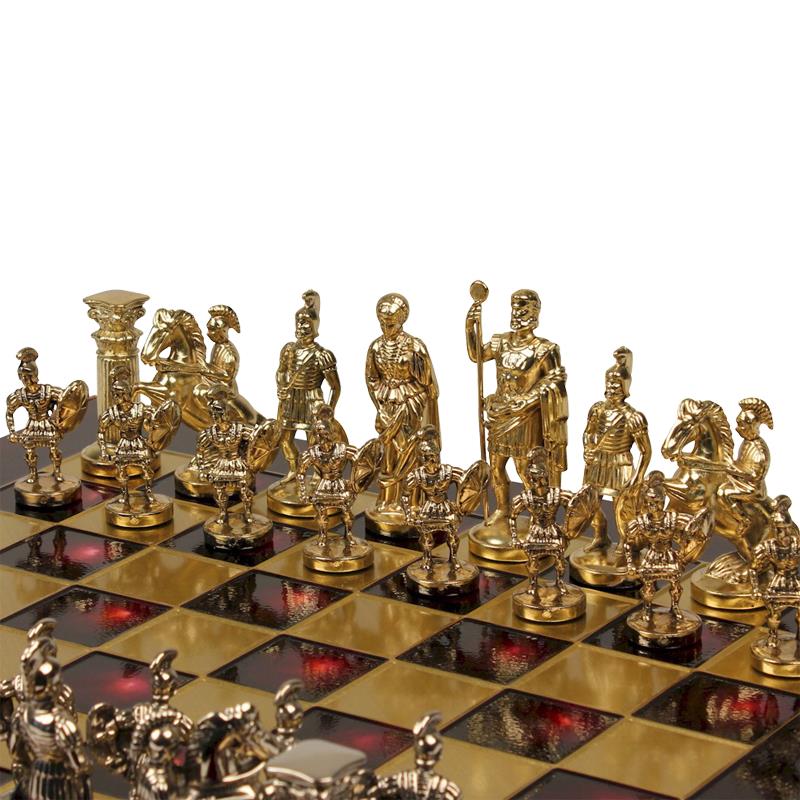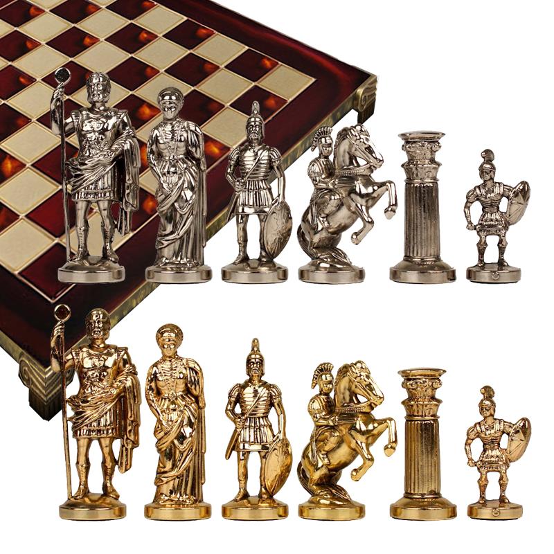 Рекомендованный набор относится к категории исторических шахмат. Ваш презент представляет греко-римскую античность — период, который хронологически шел с 8 века до н. э. и до рубежа 5—6 веков н. э. Отсюда и соответствующие представители и знаковые элементы той эпохи среди шахматных фигур, например Геракл, воины в доспехах и знаменитые греческие колонны. Все 32 фигуры выполнены с ювелирной точностью и детализацией из специального сплава «замак». В его составе главный материал — это цинк, а также присутствует медь и алюминий. Что особенно важно — нет вредных для человека веществ. Фигуры выполнены в серебряном и золотом цвете, покрыты латунью и вручную отполированы.