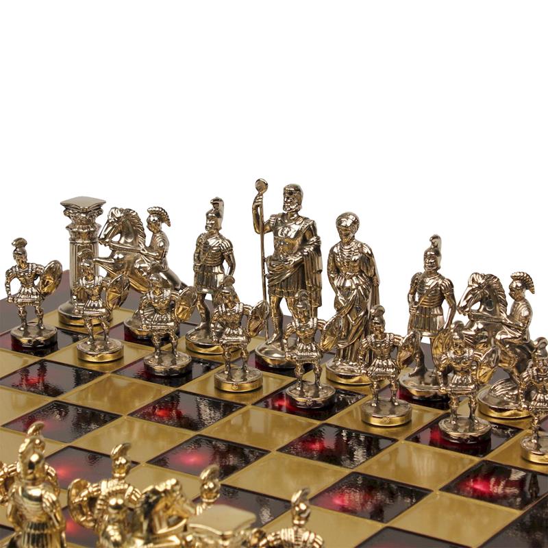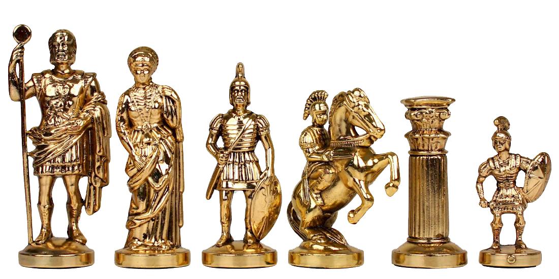 Рекомендованный набор поразит одариваемого с первого взгляда. На шахматной доске насыщенного бордового цвета расположились фигуры, представляющие собой миниатюрные статуэтки. Здесь собрались представители эпохи Древней Греции. Отважные воины и рыцари готовы сразиться на поле боя за честь прекрасной дамы, за свои земли, как было тогда, много лет назад. Восхищает филигранность исполнения фигур, внимание к мелочам, деталям. Можно рассмотреть все тонкости и нюансы атрибутики, доспехов, оружия воинов, элементы одежды. Фигуры сделаны из цинкового сплава «замак». В нем есть добавление алюминия и меди и полностью отсутствуют какие-либо вредные для организма человека примеси. Прекрасный презент для того, у кого есть маленькие дети, они тоже могут стать игроками, ведь набор предназначен для тех, кому уже исполнилось 6 лет. В комплекте 32 шахматные фигуры золотого и серебряного цвета, они покрыты сверху латунью, отполированы вручную. Привлекает внимание отделка чернением — эта обработка добавляет изделиям шарм и создает эффект старины.