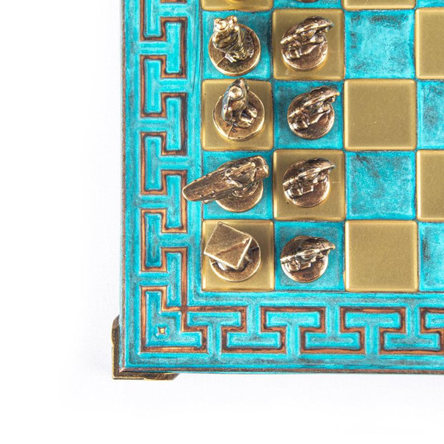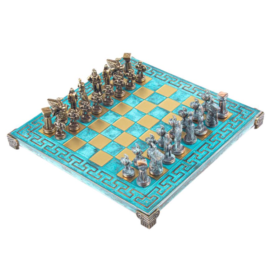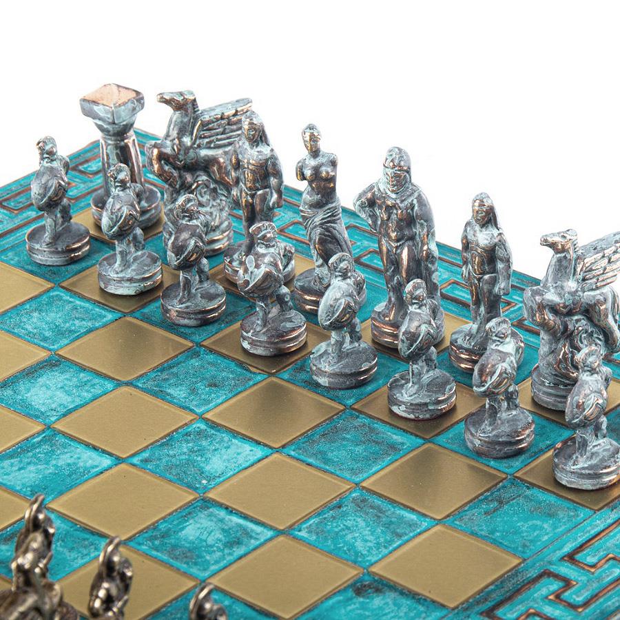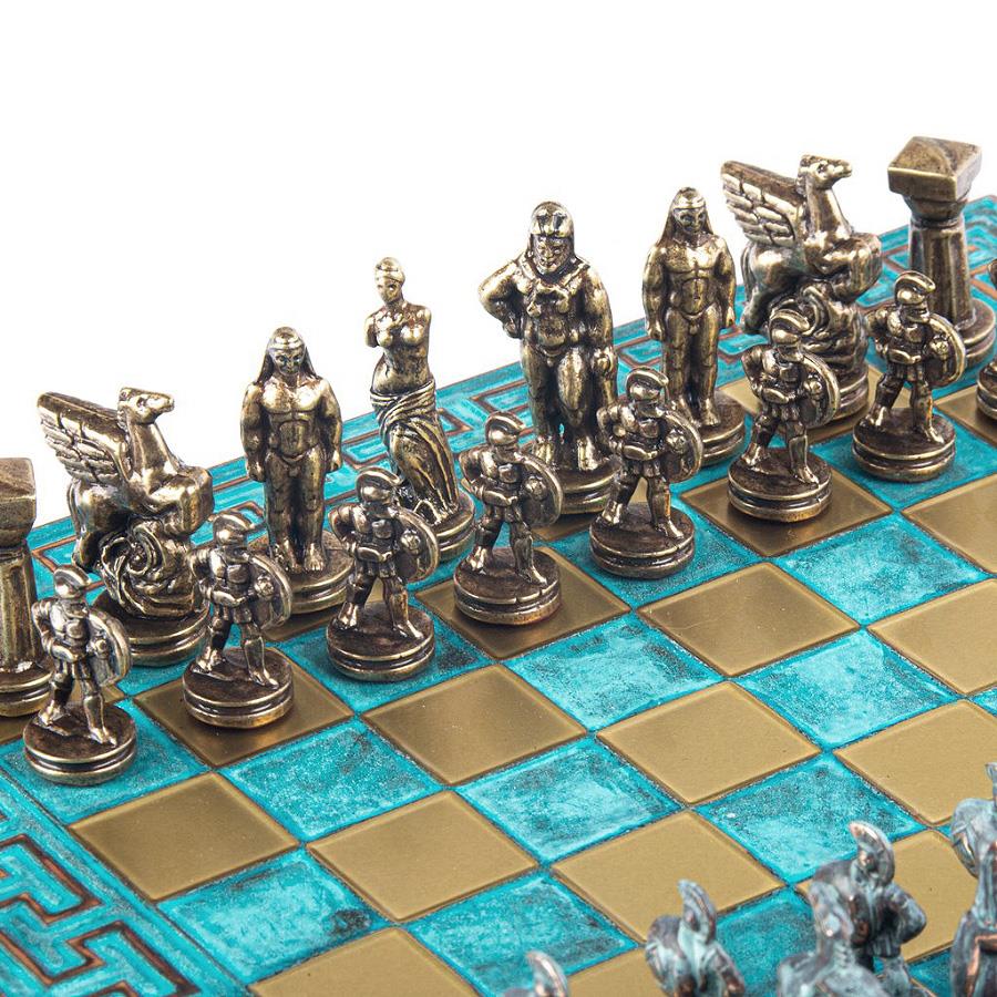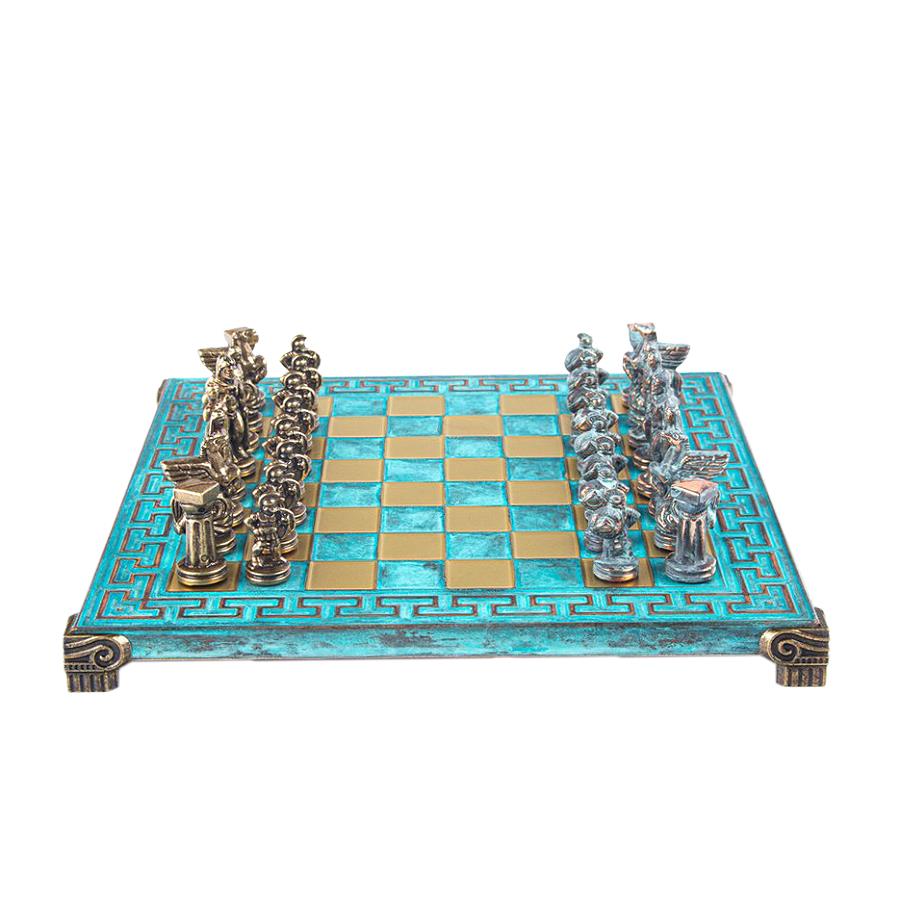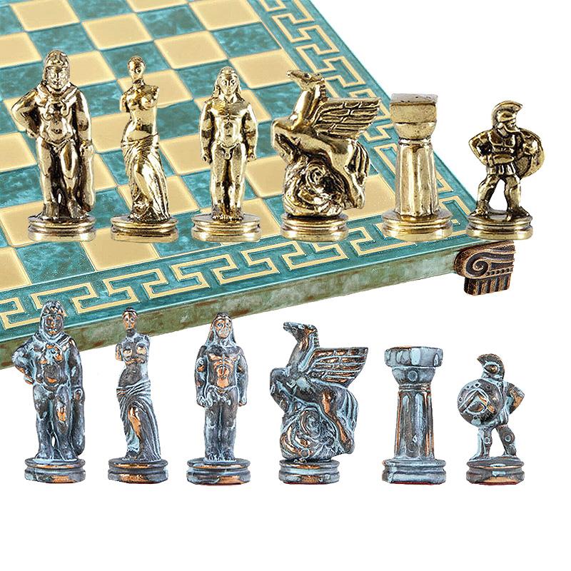 Рекомендованный набор относится к категории исторических и представляет нам как на ладони Древнюю Грецию. В качестве шахматных фигур выступают мифические существа, вроде Пегаса и античных богов. Присутствуют также отважные рыцари и воины, сражавшиеся за свои земли и прославившиеся во всем мире отвагой, храбростью и силой. Фигуры настолько точны в исполнении, что демонстрируют мельчайшие детали, такие как элементы одежды, орудия воинов и даже выражения лиц миниатюрных скульптур. Созданы статуэтки из особого сплава «замак». Он состоит из цинка, алюминия и меди, не содержит вредных примесей и прочен как сталь. Сверху фигуры покрыты латунью, отполированы вручную и разделены на два цвета: золото и патина. Патинирование — искусственное состаривание, оно внешне преображает изделия, придавая им антикварный вид.