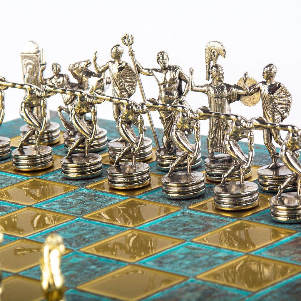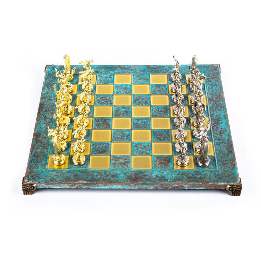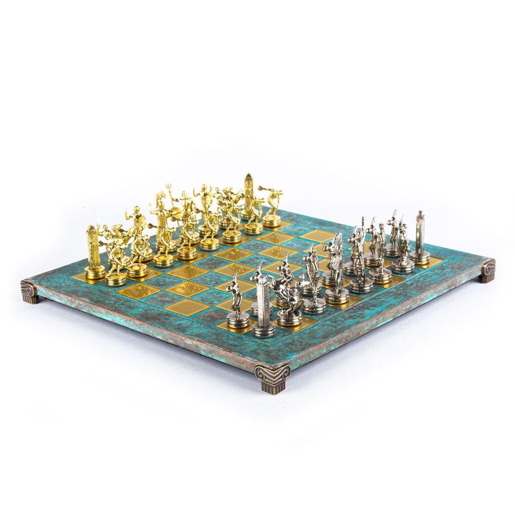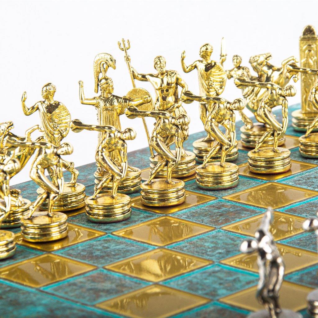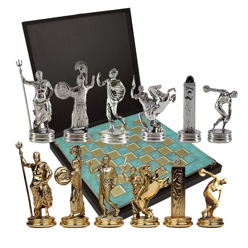 Соперничество, стремление к победе — это то, что объединяет шахматы и Олимпийские игры, именно им посвящен рекомендованный набор. В комплект входит 32 шахматные фигуры в золотом и серебряном цвете. Они представляют собой героев древнегреческой мифологии, богов, живших по преданию на горе Олимп. Зевс, Аид, Посейдон стали покровителями Олимпийских игр, а потому они заняли ключевое место среди фигур. Стоит отметить потрясающее исполнение, четкость, детализацию. Просматриваются даже изгибы ткани на одежде у статуэток, а также атрибутика, присущая этим мифическим героям. Шахматы сделаны из особого цинкового сплава «замак» с добавлением меди и алюминия. Он прочный, безопасный для здоровья, сверху покрыт латунью. Фигуры прошли дополнительную обработку полировкой, а потому блестят, как ювелирные изделия.