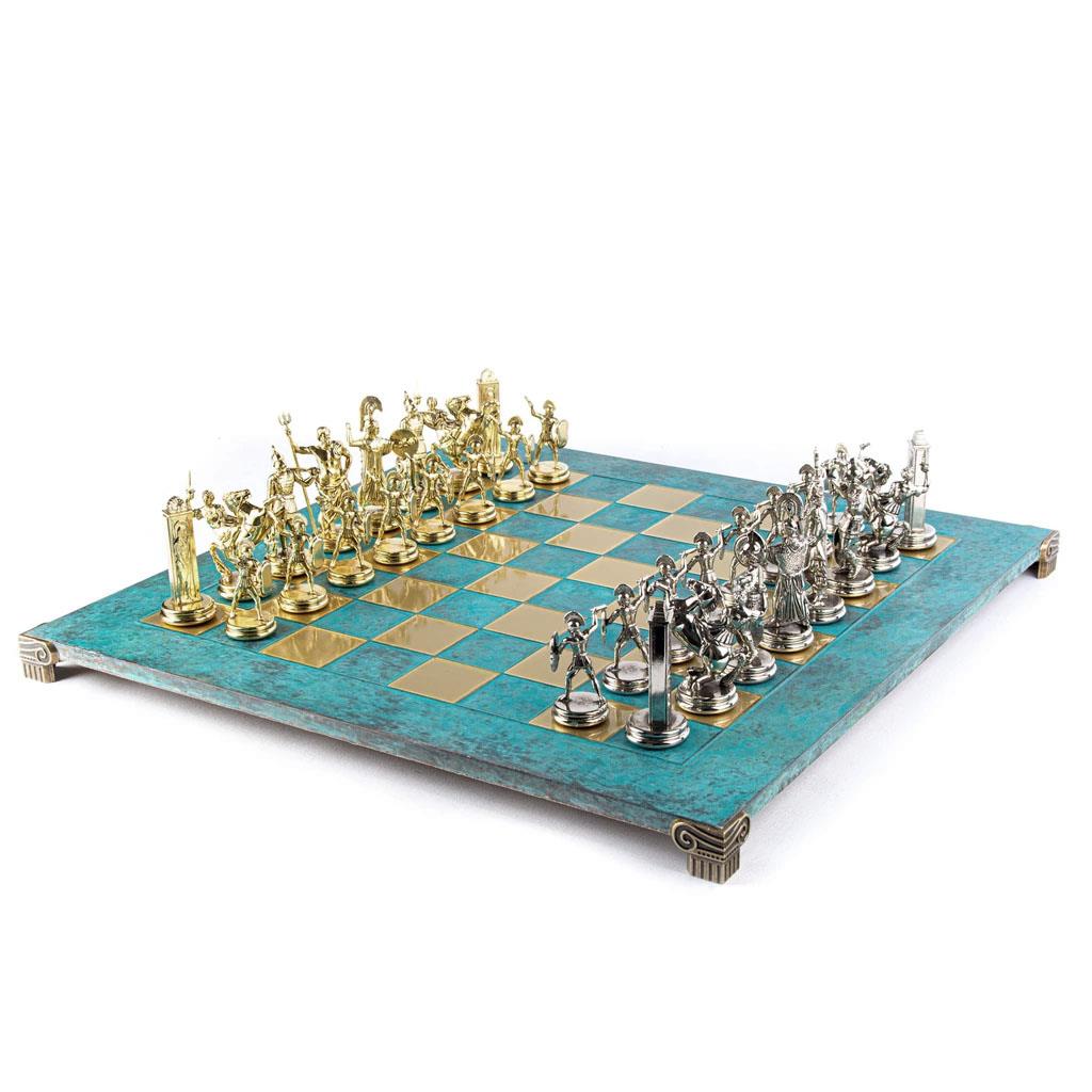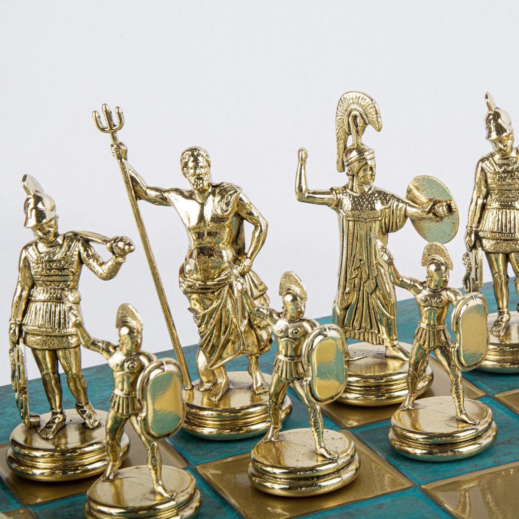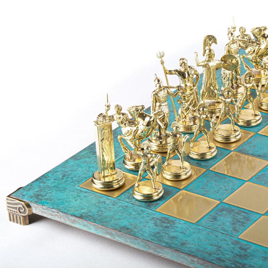 Бесконечно долго одариваемый будет рассматривать разнообразие шахматных фигур, которые поражают воображение. Данный вид шахмат подпадает под категорию «исторические», а действующими «лицами» стали герои легендарной Троянской войны. Отважные воины застыли в естественных позах на игровом поле. Филигранное исполнение, невероятная точность позволяют рассмотреть даже выражение лиц героев. Шахматные фигуры изготовлены из цинкового сплава, что широко используется в литейном производстве — замак. Латунное покрытие и ручная полировка превратили обычные металлические фигуры в блестящие миниатюрные скульптуры. Потрясающая работа, достойная внимания самой взыскательной персоны.