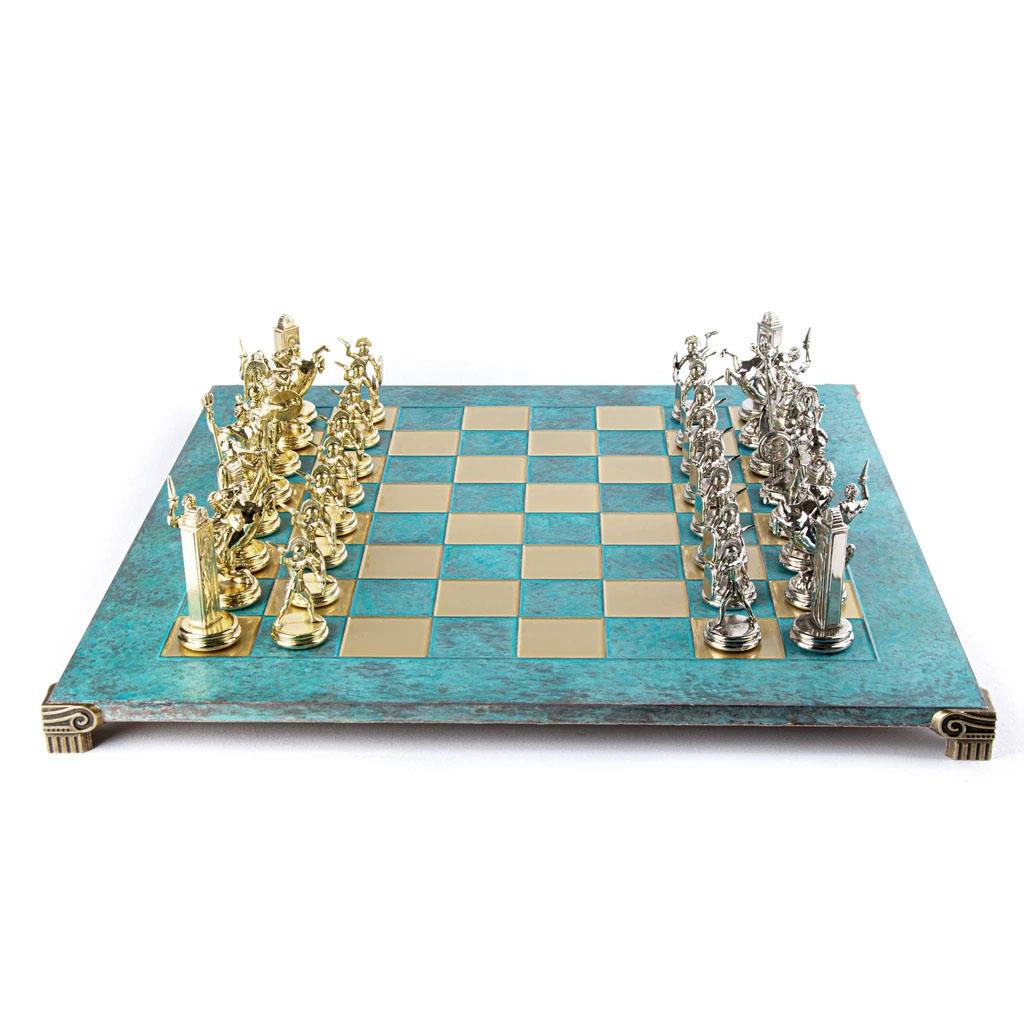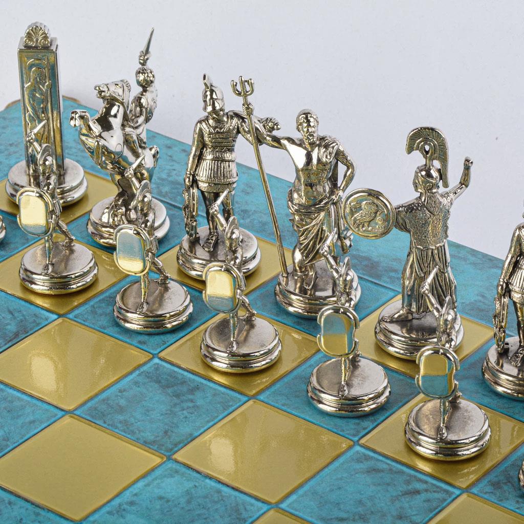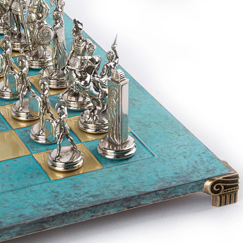 Бесконечно долго одариваемый будет рассматривать разнообразие шахматных фигур, которые поражают воображение. Данный вид шахмат подпадает под категорию «исторические», а действующими «лицами» стали герои легендарной Троянской войны. Отважные воины застыли в естественных позах на игровом поле. Филигранное исполнение, невероятная точность позволяют рассмотреть даже выражение лиц героев. Шахматные фигуры изготовлены из цинкового сплава, что широко используется в литейном производстве — замак. Латунное покрытие и ручная полировка превратили обычные металлические фигуры в блестящие миниатюрные скульптуры. Потрясающая работа, достойная внимания самой взыскательной персоны.