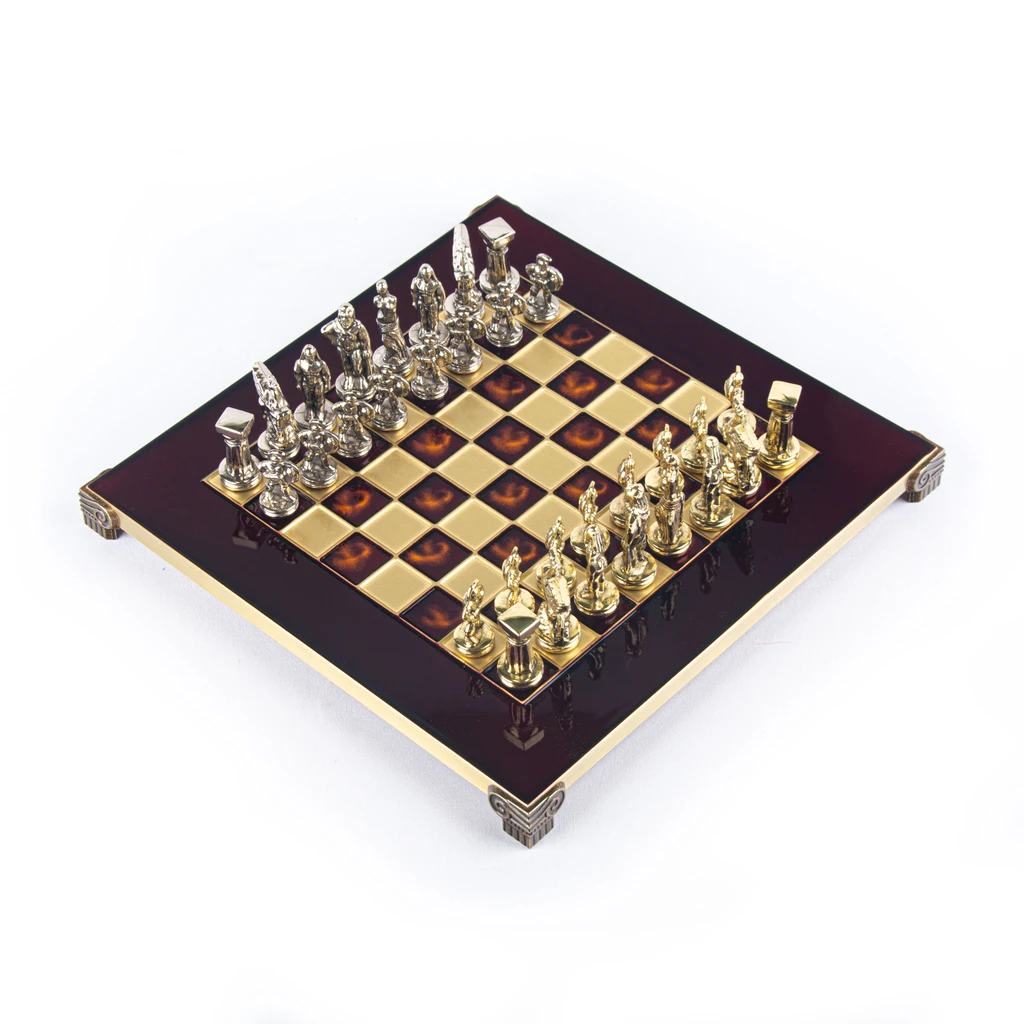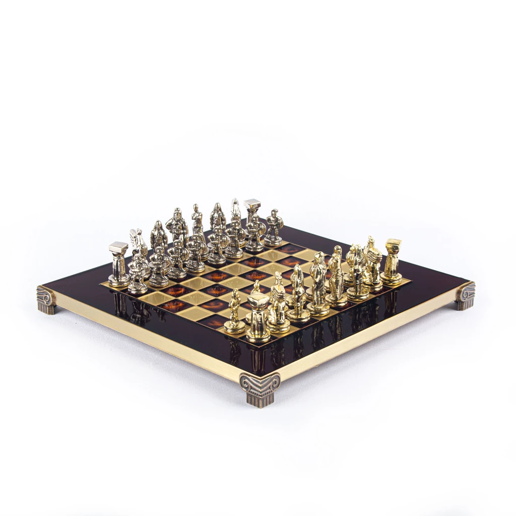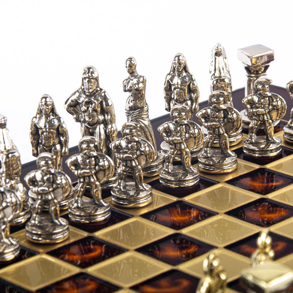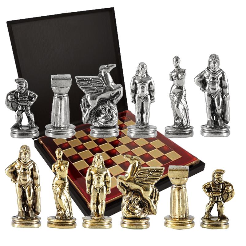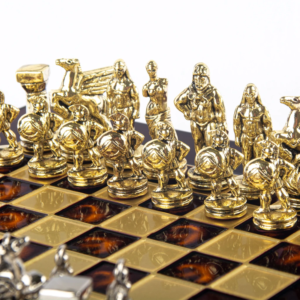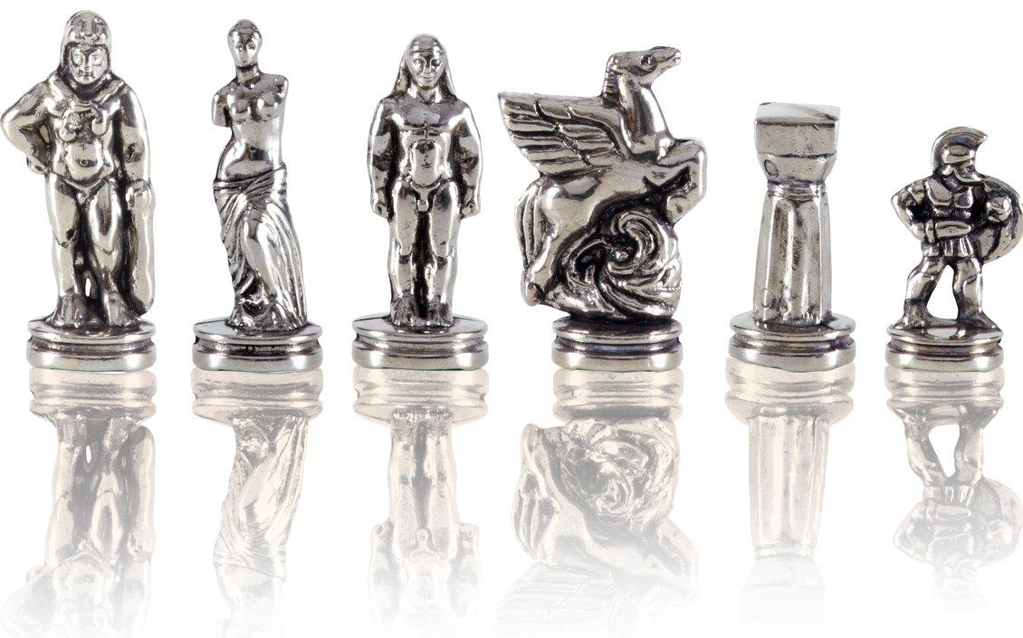 Представленный набор сразу и безвозвратно окунает в мифологию Древней Греции, демонстрируя невероятных героев мифов и легенд на игровом поле. В качестве шахматных фигур выступают античные воины, божества, мифические существа, такие как Пегас — знаменитый крылатый конь, летающий с быстротой ветра. Преимуществом этого набора стала филигранность исполнения, высокая степень прорисовки деталей, прочность шахматных фигур и их безопасность для организма человека. Все дело в том, что миниатюрные статуэтки сделаны из особого сплава «замак». Он состоит из цинка, алюминия и меди и не содержит вредных примесей. Фигуры сверху покрыты латунью и отполированы вручную. Всего 32 фигуры серебряного и золотого цвета.