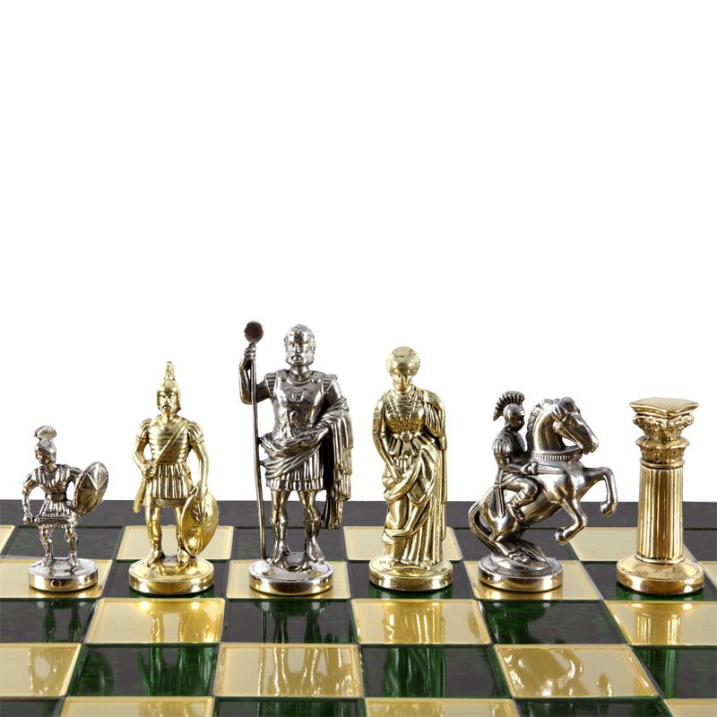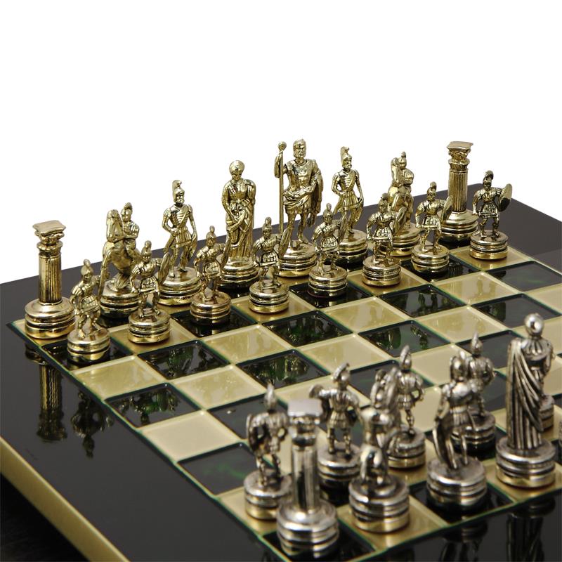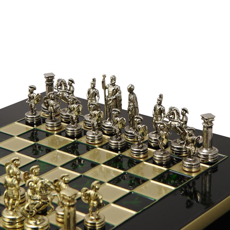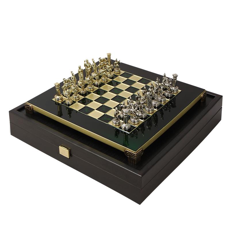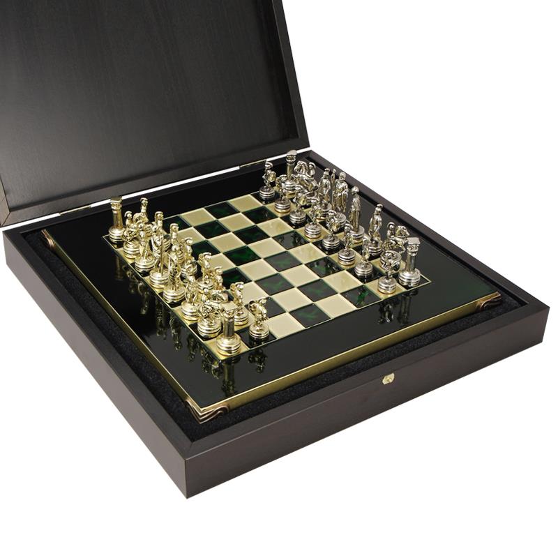 Древняя Греция подарила нам бессмертные легенды и мифы со своими невероятными героями Аидом, Зевсом, Аполлоном, Гераклом. Дизайнеры вдохновились историей и создали шахматные фигуры, которые перенесут одариваемого в античный мир. На игровом поле стройным рядами по игровым клеткам шагают храбрые воины. Фигуры золотого и серебряного цвета созданы из особенного сплава «замак», который широко используется ювелирами в работе. Он прочный, безопасный для здоровья человека, потому как состоит из цинка, алюминия и меди без добавления опасных примесей. Сверху фигуры покрыты латунью и отполированы вручную до блеска. При внимательном осмотре можно заметить чернение, такая обработка придает особый шарм изделиям, они становятся похожи на антиквариат, что всегда высоко ценится.