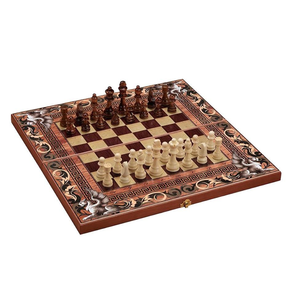 Для одариваемого как для истинного патриота будет важно знать о том, что его набор — результат работы отечественного производителя. Без сомнения можно сказать о том, что комплект заслуживает самой высокой похвалы. Качественный, потрясающе красивый, он при этом имеет демократичную цену, что непременно радует. Изготовлен комплект из бука — самого подходящего для шахматных наборов материала. Его долговечная, прочная и износоустойчивая древесина позволяет храниться изделиям настолько долго, что они могут претендовать на роль семейной реликвии. С помощью шелкографии украшен периметр доски. Здесь можно видеть 2 вида орнаментов — растительный узор и орнамент в греческом стиле. Но самым главным украшением стало изображение мантикоры. Это мифическое существо с телом льва и головой человека будет служить устрашением для противника и станет талисманом для одариваемого во время игры. 32 шахматные фигуры хранятся внутри складной доски. А еще одним сюрпризом для одариваемого станет то, что набор представляет собой 3 в 1. Имеются также фишки для игры в шашки и нарды, что предоставит возможность выбора и подарит массу приятных эмоций.