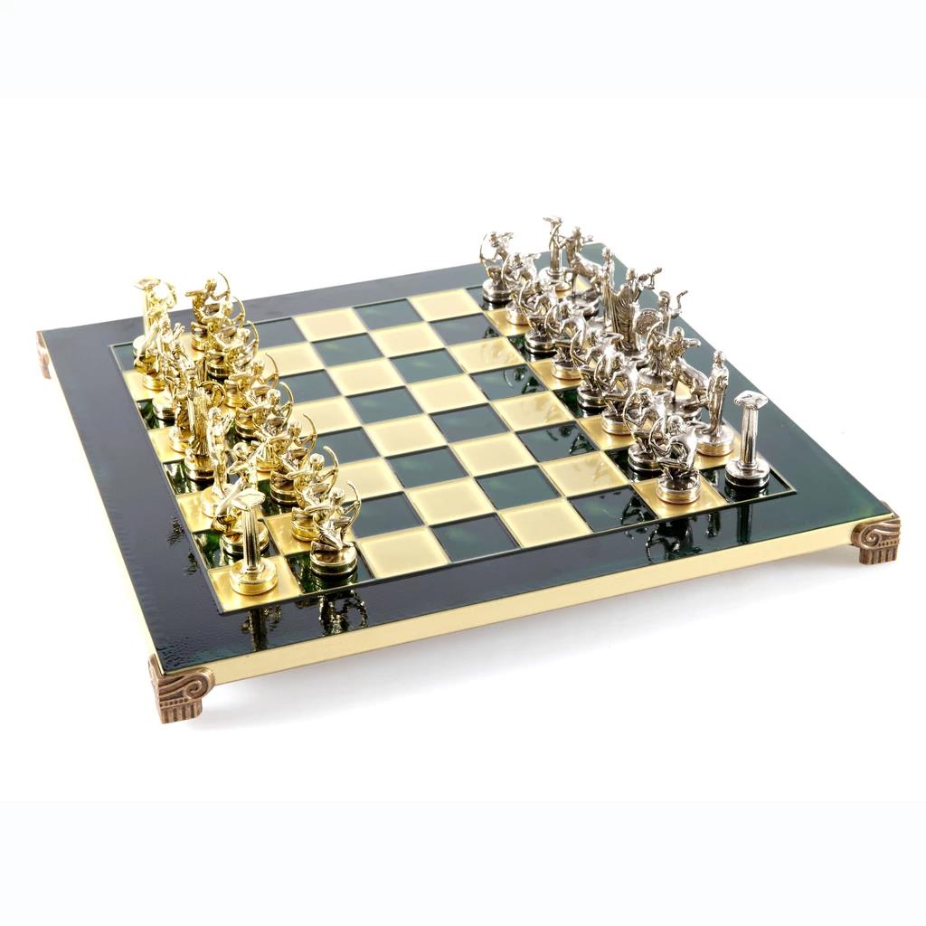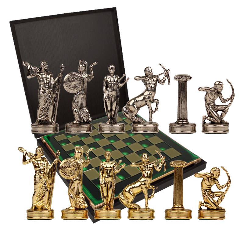 Рекомендованный набор посвящен Олимпийским играм, и это выдают потрясающие шахматные фигуры, которые сделаны в честь самых главных богов из мифологии Дреней Греции. Здесь одариваемый найдет Зевса, Аида и Посейдона. Эти боги считаются покровителями Олимпийских игр. Фигуры сделаны из особого сплава «замак». Он представляет собой соединение цинка, меди и алюминия, прочный, как сталь, и совершенно безвредный для организма человека. Сплав широко применяют в ювелирном деле, а потому фигуры выглядят как ювелирные изделия, настолько филигранно они исполнены. Просматривается атрибутика героев: одежда, доспехи — все это поражает воображение. Как и в классических шахматных наборах, у фигур два цвета — золотой и серебряный. Покрытие латунью и полировка придают изделиям законченный внешний вид.