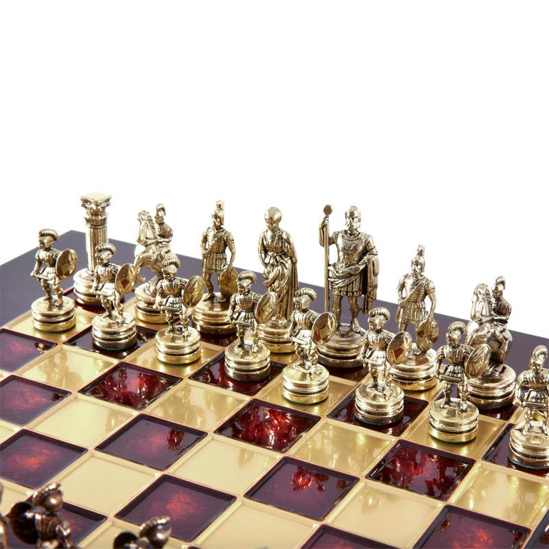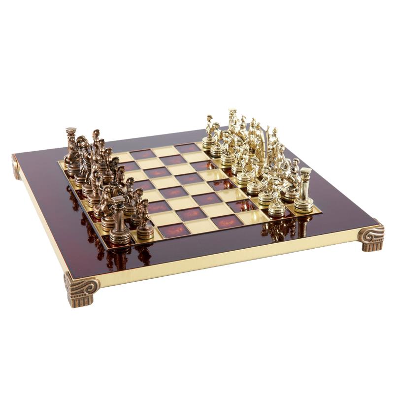 Рекомендованный набор перенесет одариваемого во времена античности. Дело в том, что этот шахматный комплект входит в категорию исторических, и все фигуры в нем детально повторяют элементы одежды, доспехи воинов той эпохи. Античные рыцари с копьями, мечами, щитами и в характерных шлемах коринфского типа передают дух тех времен. Филигранное исполнение позволяет рассмотреть даже мимику миниатюрных статуэток. Чудесное исполнение стало возможным благодаря сплаву «замак». Он состоит из цинка, алюминия и меди и не содержит опасных для здоровья человека веществ. Фигуры изготовлены в двух цветах — по 16 золотых и бронзовых. Они имеют латунное покрытие и отполированы вручную мастером. Присутствует чернение, которое придает антикварный вид шахматным фигурам.