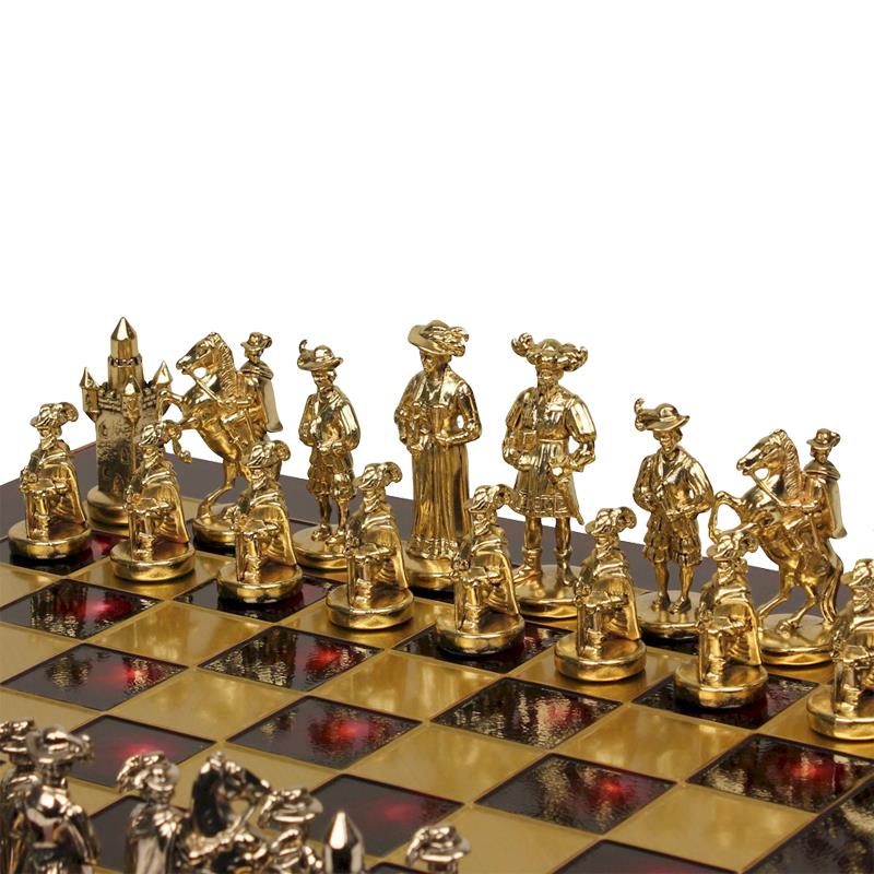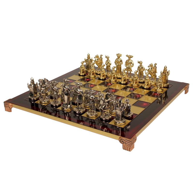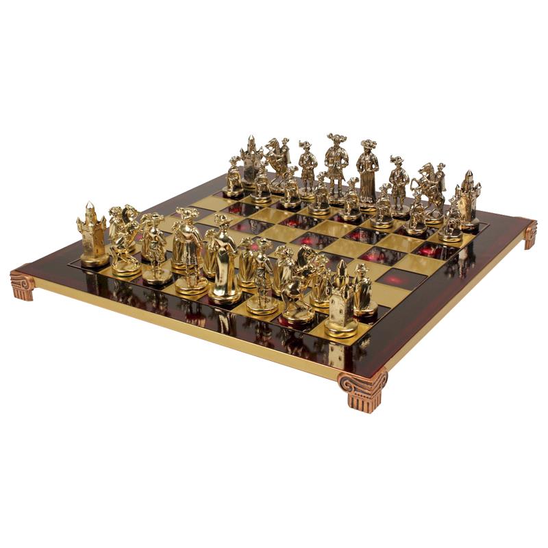 Взглянув на представленный набор, одариваемый в один миг перенесется в эпоху Средневековья, которая запомнилась рыцарскими сражениями, крестовыми походами и необычной архитектурой с замками. Удивительно, но все эти знаковые моменты, характерные для того времени, отражены в комплекте шахмат. 32 фигуры изготовлены по особой технологии из специального сплава «замак», в него входят цинк, алюминий, медь. По плотности этот сплав можно сравнить со сталью, он не содержит вредных для человека элементов свинца и никеля, поэтому широко используется ювелирами. Вот и в вашем презенте фигуры выглядят как статуэтки ювелирной работы, с подробной детализацией и в цвет серебра с золотом. Латунное покрытие и полировка вручную довели фигуры до совершенства.