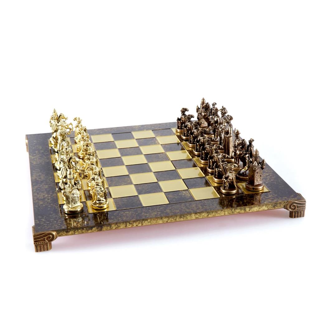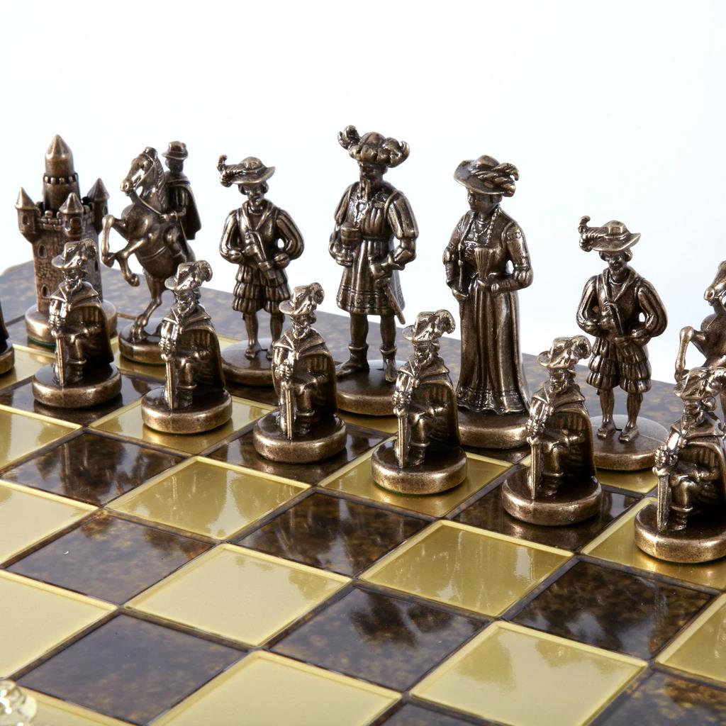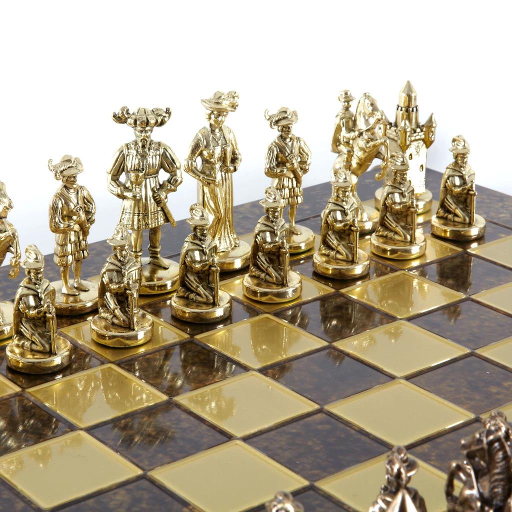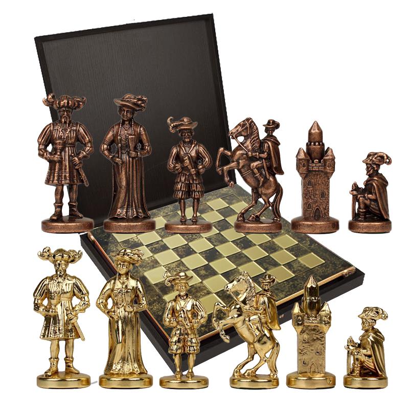 Благодаря рекомендованному шахматному набору одариваемый сможет побывать в средневековой Европе. Этот период отмечен в истории множеством войн, расцветом архитектуры, влиянием церкви. Эти моменты нашли отражение в наборе в виде шахматных фигур. Здесь присутствуют средневековые рыцари, замки, на героях отчетливо видна характерная одежда того времени, и все это среди миниатюрных статуэток, похожих на ювелирные. Кстати, ювелирными их легко можно назвать, потому что изготовлены они из особого сплава «замак», что широко используется в ювелирном деле. Он состоит из цинка, меди, алюминия и не содержит вредных веществ, что является безоговорочным плюсом. Фигуры имеют латунное покрытие, отполированы вручную и выполнены в двух цветах — бронзовом и золотом. Бронзовые статуэтки дополнительно обработаны чернением. Это старинный способ декоративной обработки драгоценных и полудрагоценных металлов, благодаря которому изделия приобретают антикварный вид.