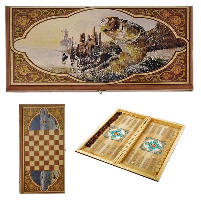 Что может подкупить любого человека — уважение к выбору его хобби, особенно, если это рыбалка. Одариваемый будет счастлив увидеть декоративное оформление выбранного вами набора, поскольку на нем изображен богатый улов в виде огромной рыбы. Именно о такой мечтают заядлые рыбаки. Индивидуальный презент будет хорошим напоминанием о вас долгие годы, ведь набор прослужит не одно десятилетие. Он сделан отечественной компанией «Перфекто» из натурального дерева — березы. Производитель использовал качественную фурнитуру и все комплектующие разместил внутри складной доски: шашки, фишки, 2 игральные кости. Общий вес набора составляет всего 1,11 кг. Теперь одариваемый сможет брать с собой набор куда угодно, в том числе и на любимую рыбалку, где будет играть с товарищами в нарды, шашки в свободное от хобби время.