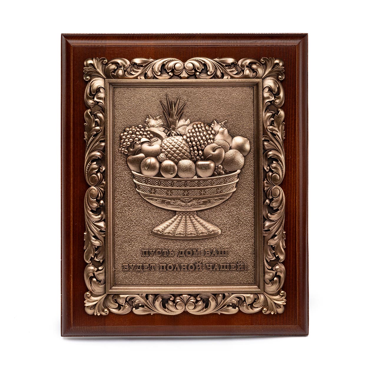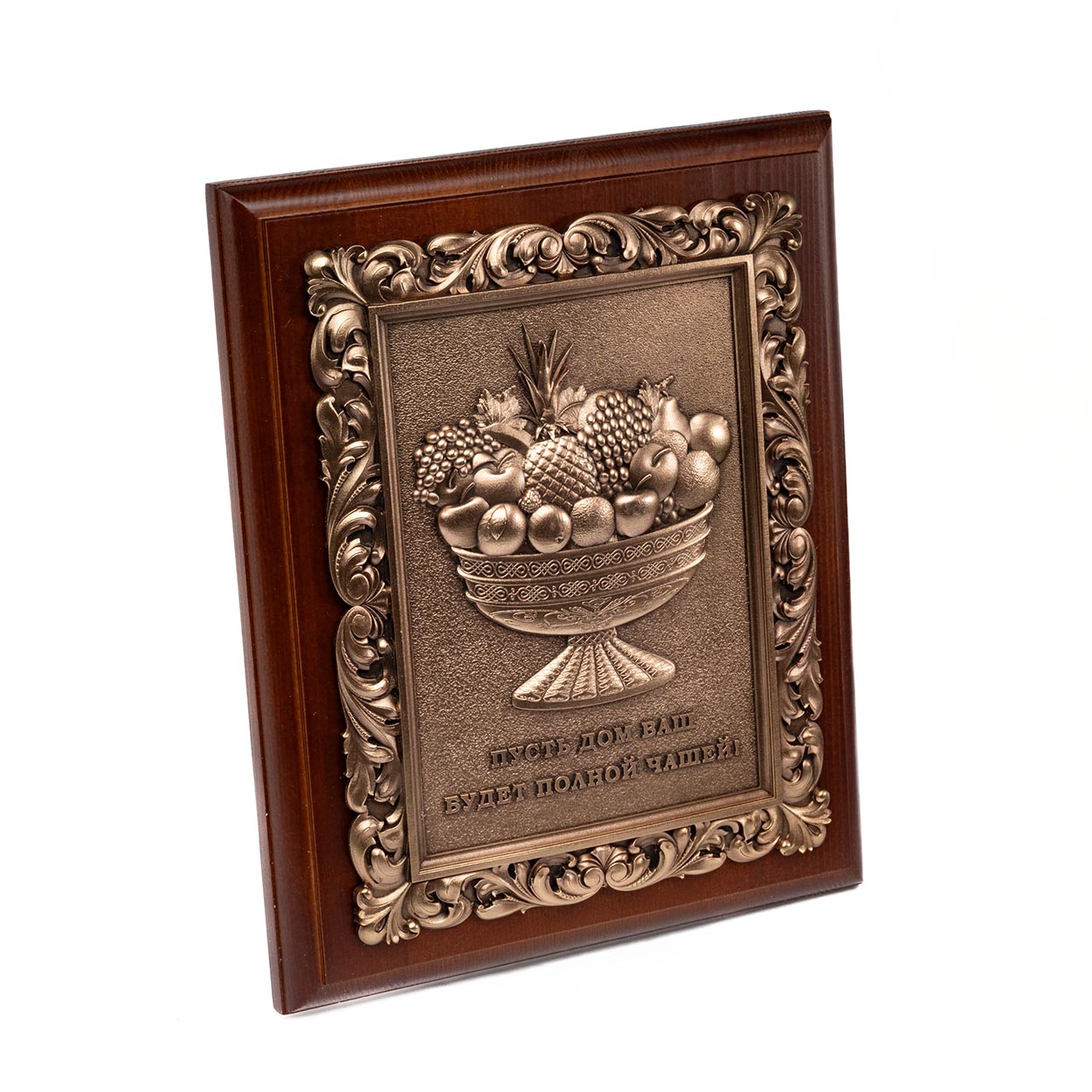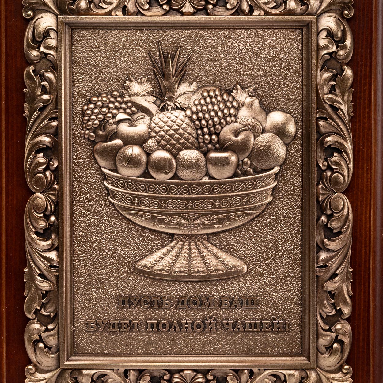 Панно «Чаша Изобилия» производит сильное впечатление особой тонкостью проработки каждой детали. Основой для него служит рамка, составленная из оригинального фигурного багета, который вырезан из натуральной древесины европейского ореха. Фоновое поле-паспарту, находящееся внутри деревянной рамки, окрашено колоритной темно-бордовой эмалью. По периметру его окаймляет отлитый из медного сплава декоративный орнамент, изготовленный по современной технологии точного художественного литья.