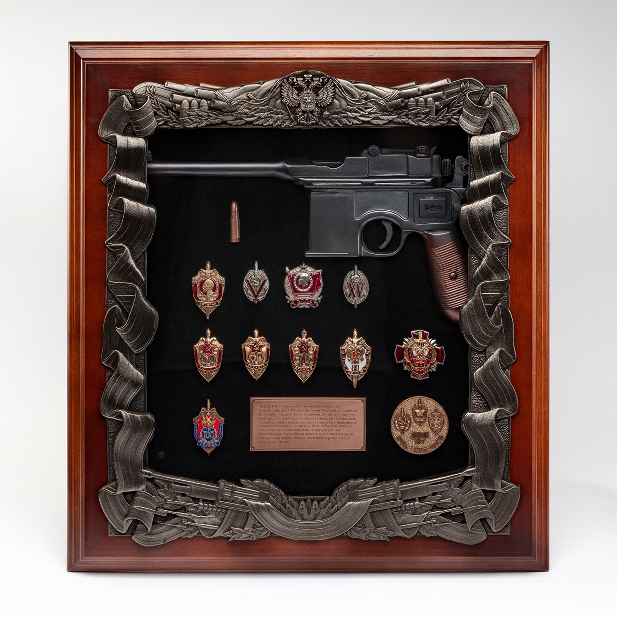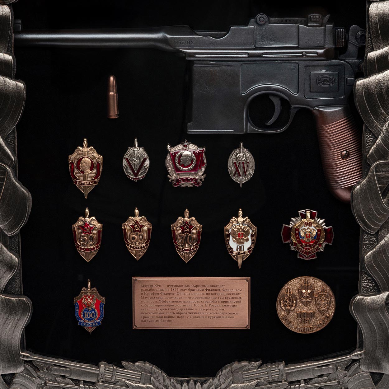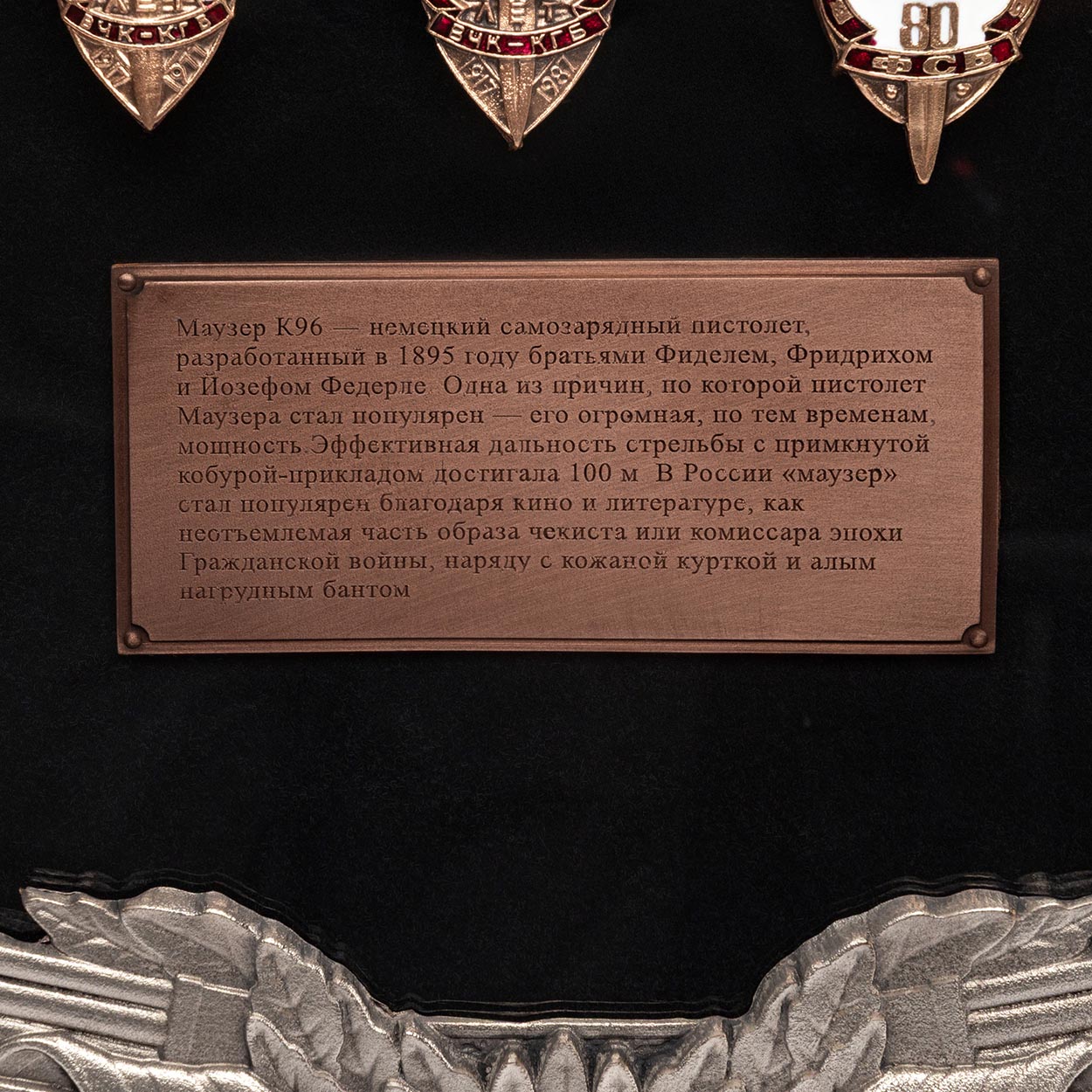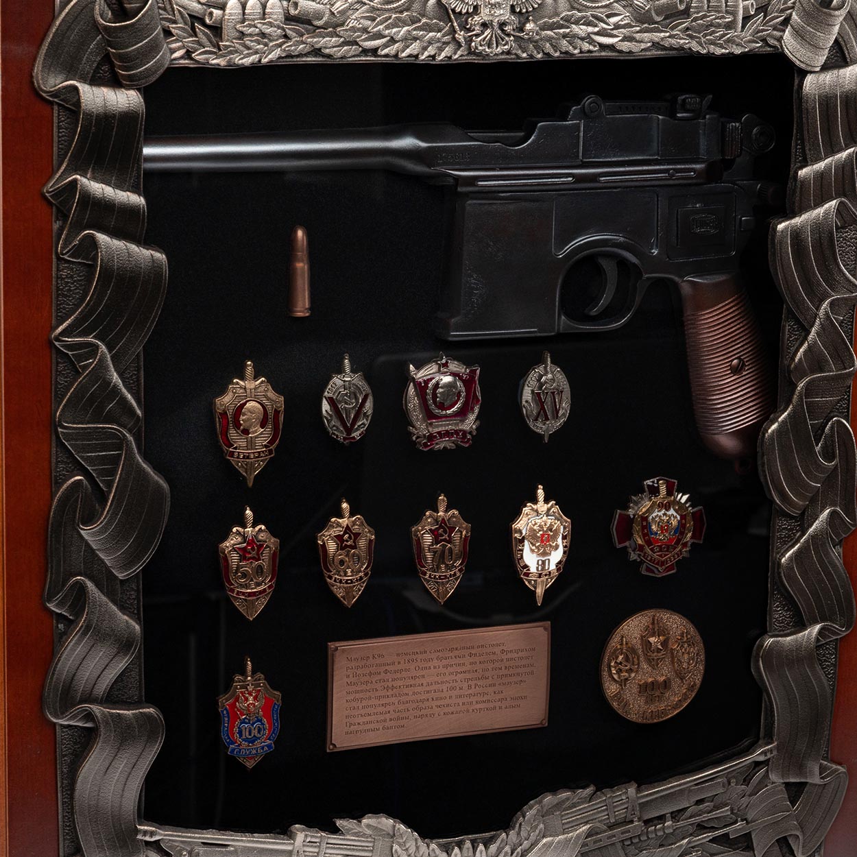 Центральная часть панно представляет собой пространство, облагороженное мягким темным бархатом. На его фоне эффектно смотрятся макет легендарного пистолета Маузер и почетные знаки, вручавшиеся в разные годы сотрудникам силовых подразделений нашей страны. Знаки окрашены стойкой к повреждениям ювелирной эмалью. По периметру их охватывает декоративное обрамление, изготовленное из медного сплава методом точного художественного литья. Его поверхность покрыта никелевым напылением. В сюжете обрамления гармонично соединились георгиевская лента, стволы оружия разных эпох, лавровые ветви и российский герб.