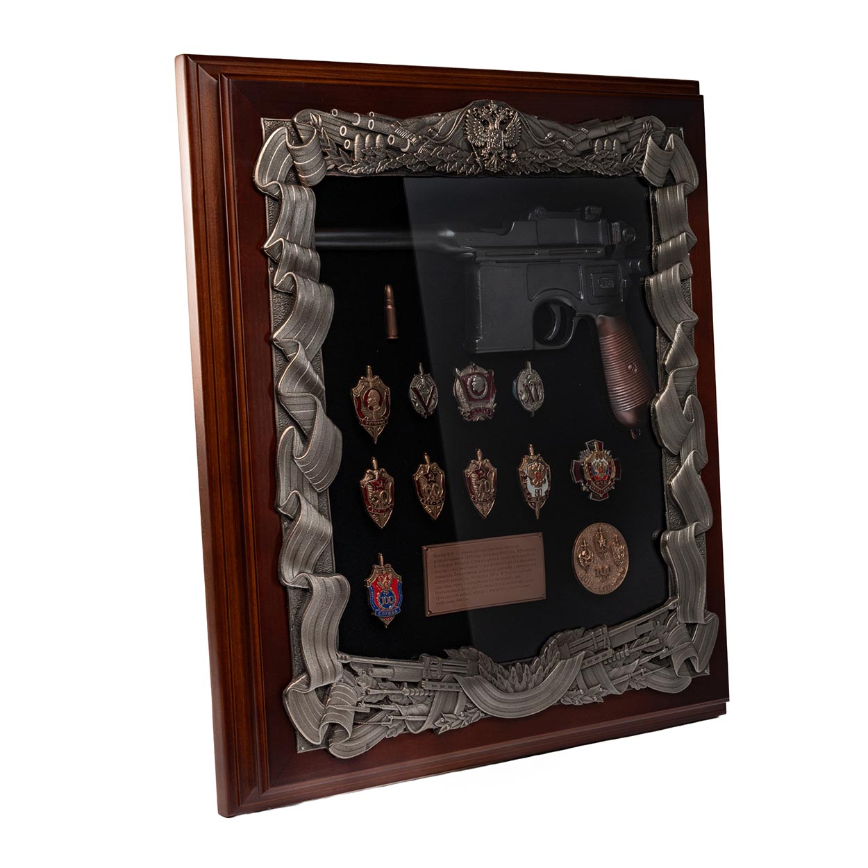 Панно с пистолетом Маузер и знаками ФСБ – наглядное напоминание о суровом периоде в истории нашей страны. Основой для него служит рамка, выполненная из фигурного деревянного багета. Для его изготовления создатели аксессуара использовали массив европейского ореха, отличающийся красивой внешней текстурой и приятной на ощупь поверхностью. На обратной стороне багетной рамки предусмотрены крепления для закрепления предмета на стене.