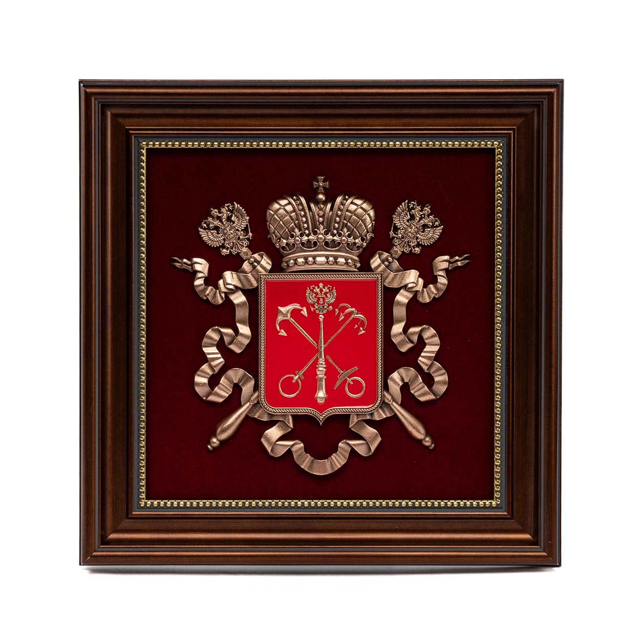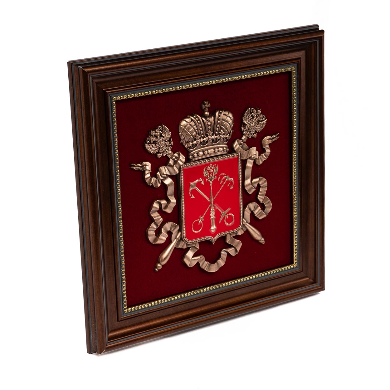 Ограниченное рамой центральное поле аксессуара заполнено колоритным бархатным паспарту насыщенного бордового цвета. На его фоне гармонично разместился фигурный барельеф в виде герба российской культурной столицы. Барельеф изготовлен из металлической медной основы по технологии точного художественного литья под давлением. Его поверхность прошла дополнительную ручную полировку.