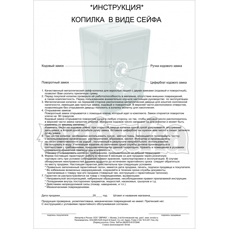 | Особенности | - два замка (кодовый и обычный); - в комплекте два ключа. |