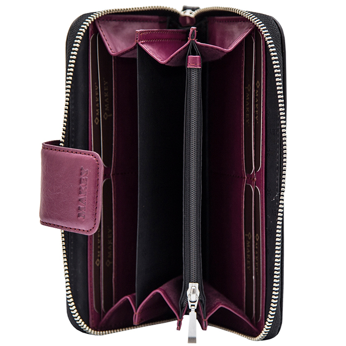 | Количество отделений | - три отделения для купюр; - карман для мелочи на молнии; - восемь секций для кредитных карт; - два отделения для бумаг. |