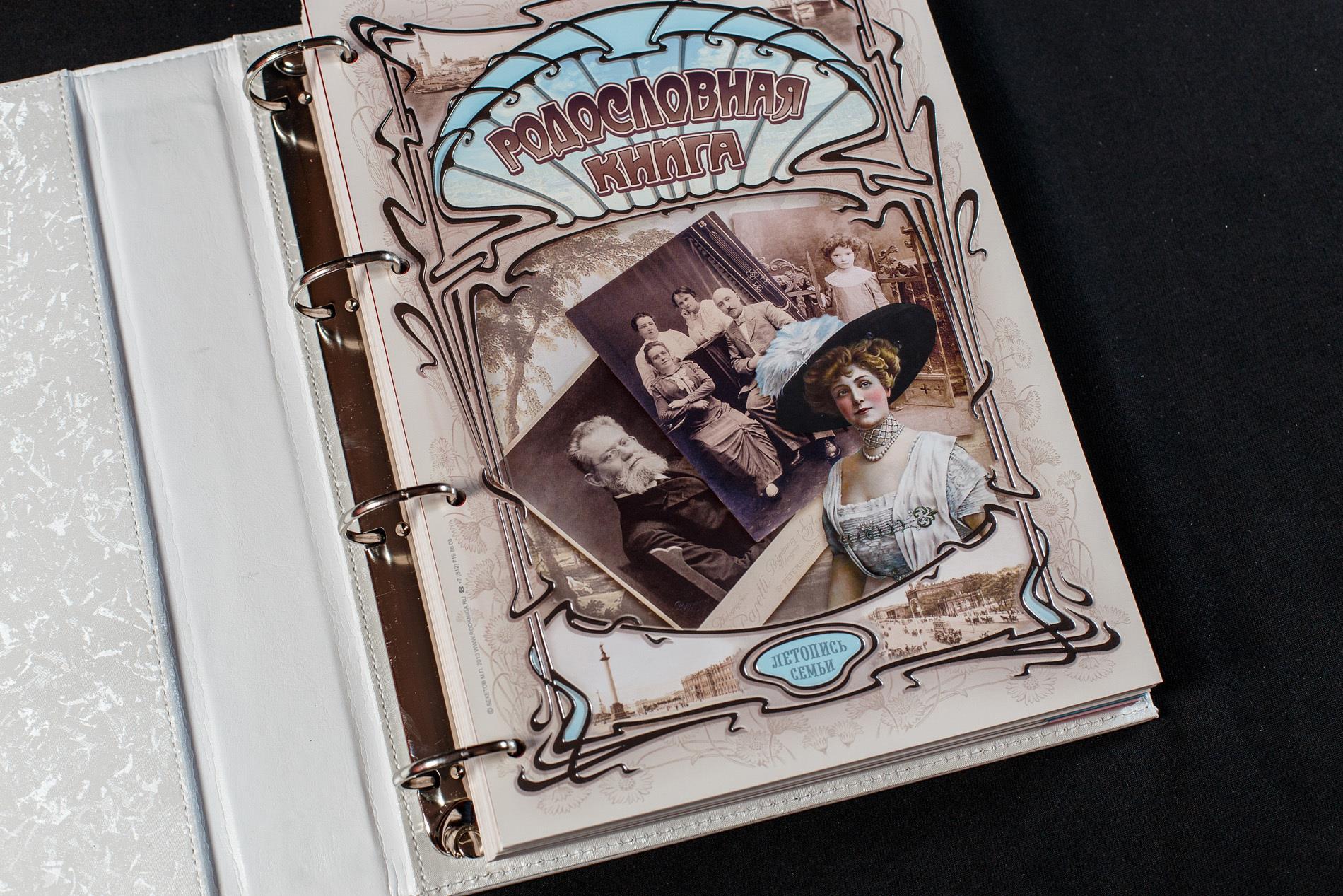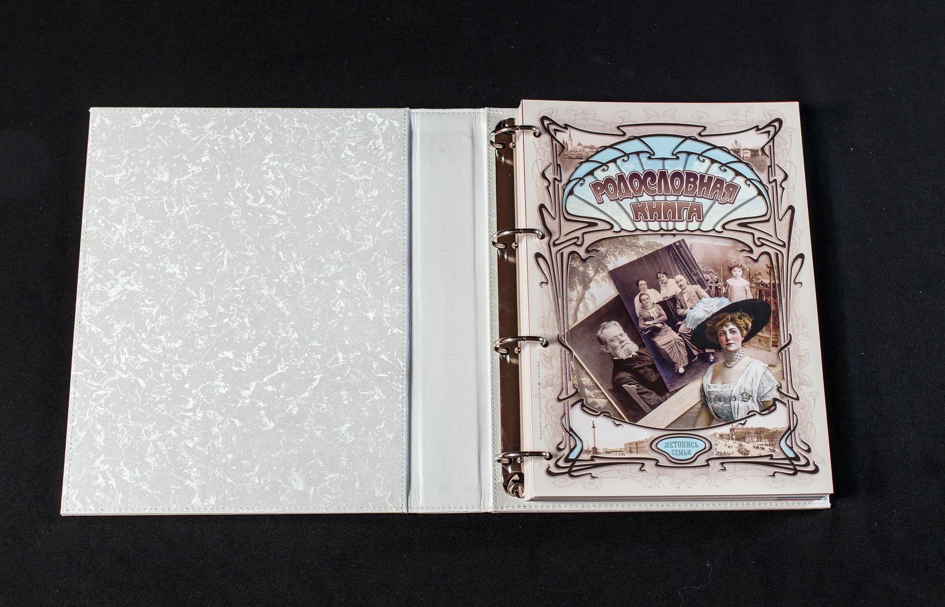 | Комплектация | - обложка с кольцевым механизмом; - внутренний художественный блок для заполнения; - брошюра с описанием структуры заполнения родословной книги; - компакт-диск с файлами для печати дополнительных персональных листов книги; - подарочный сертификат на бесплатное оформление родословного древа. |