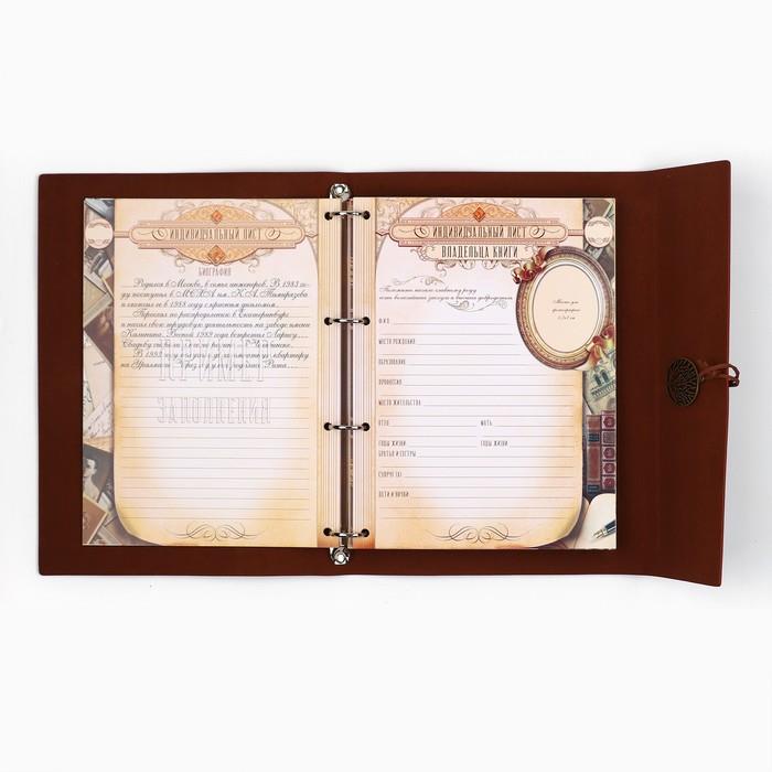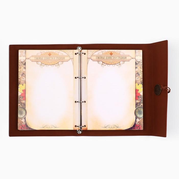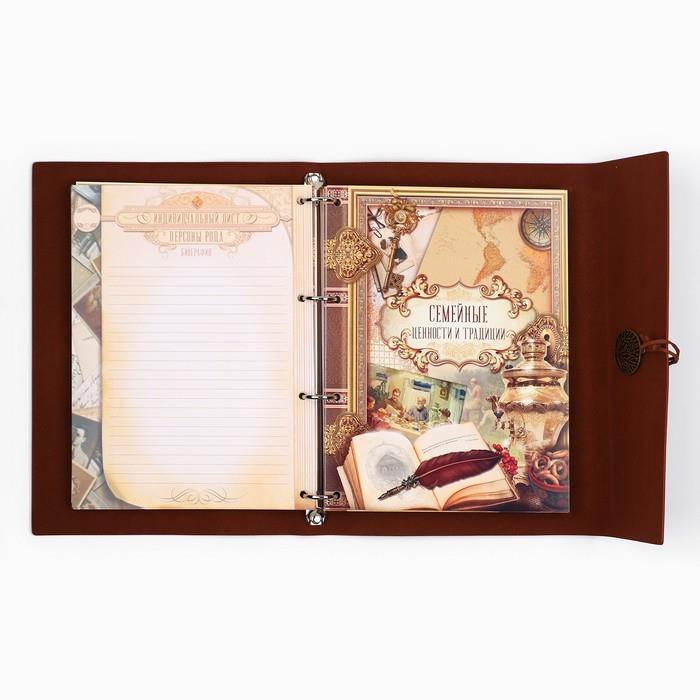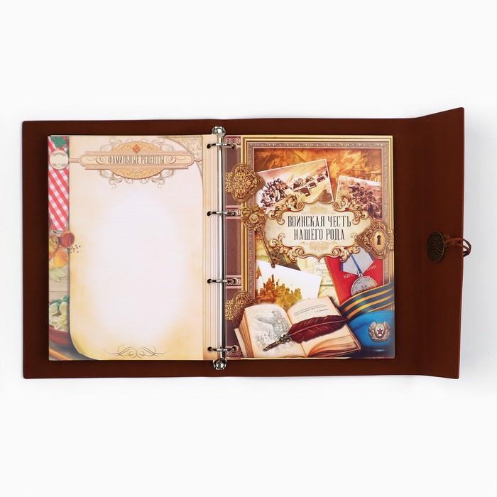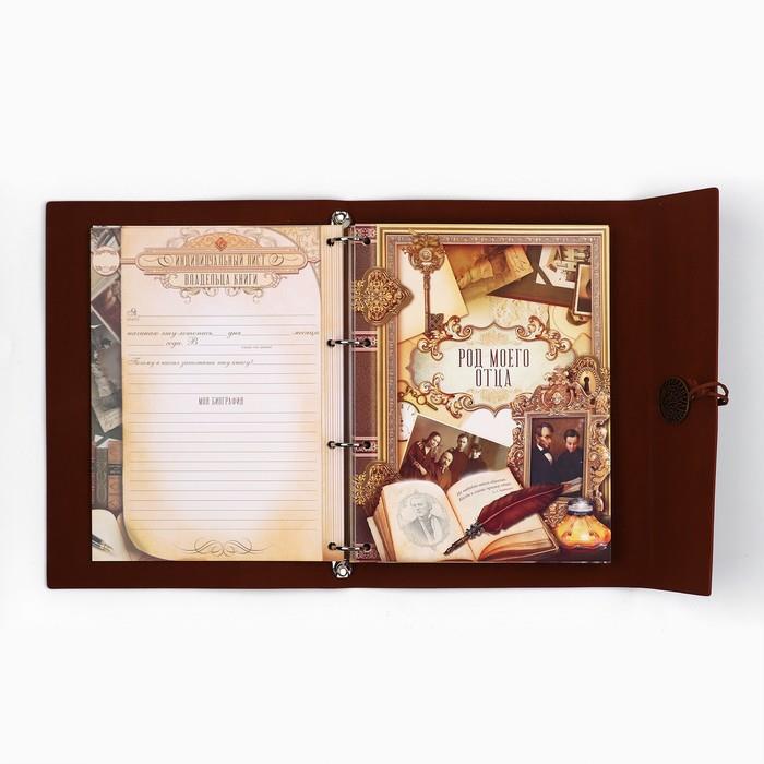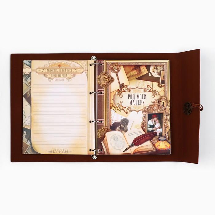 | Комплектация | - рекомендации по заполнению; - история фамилии; - словарь терминов родства; - персональные листы; Тематические разделители: - «Род отца»; - «Род матери»; - «Род отца по линии супруга (супруги)»; - «Род матери по линии супруга (супруги)»; - «Воинская честь нашего рода»; - «Мой род в ВОВ»; - «Семейные ценности и традиции»; - «Фамильные рецепты»; - «Свадьбы нашего рода»; - «Люди, прославившие наш род»; - «Светлая память нашим предкам»; - календарь семейных дат; - семейная адресная книга; - карман для послания потомкам. |