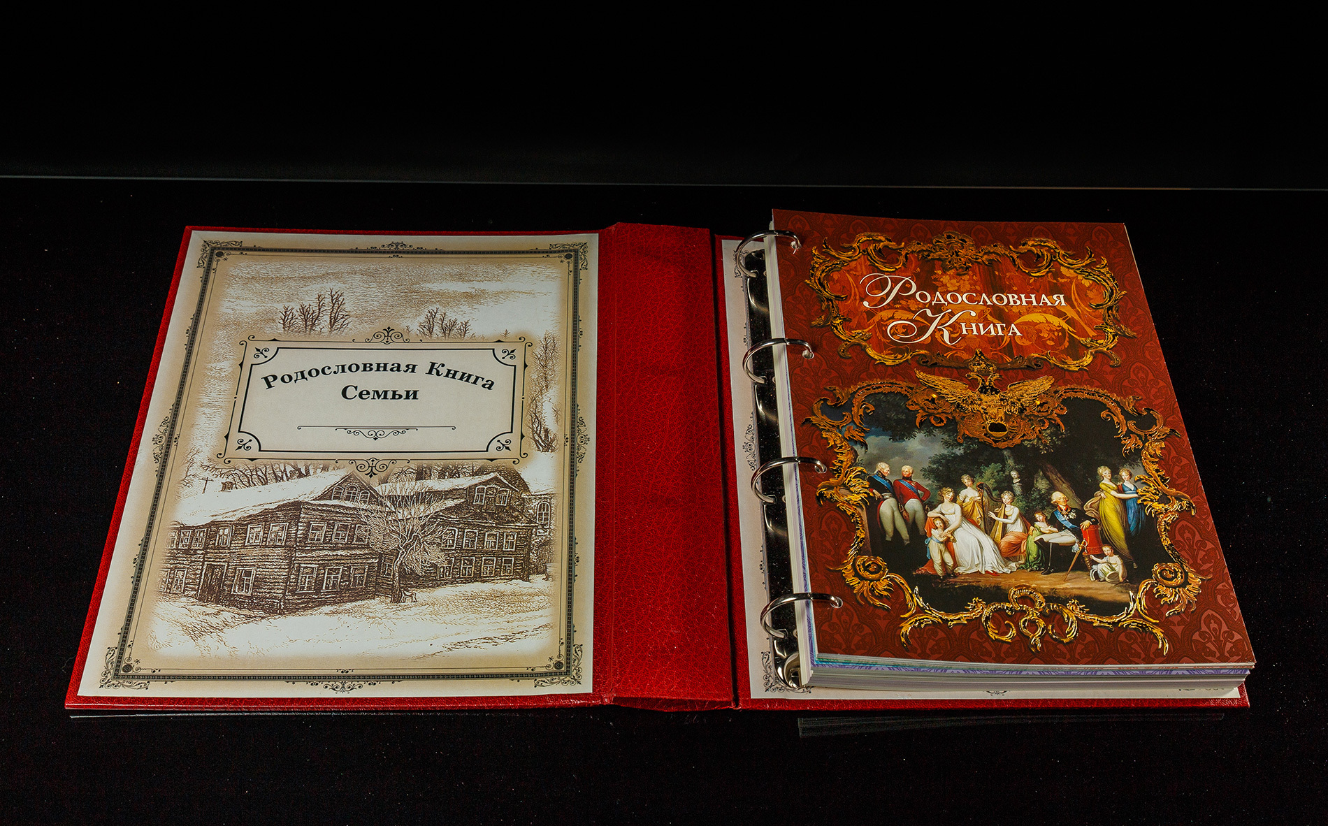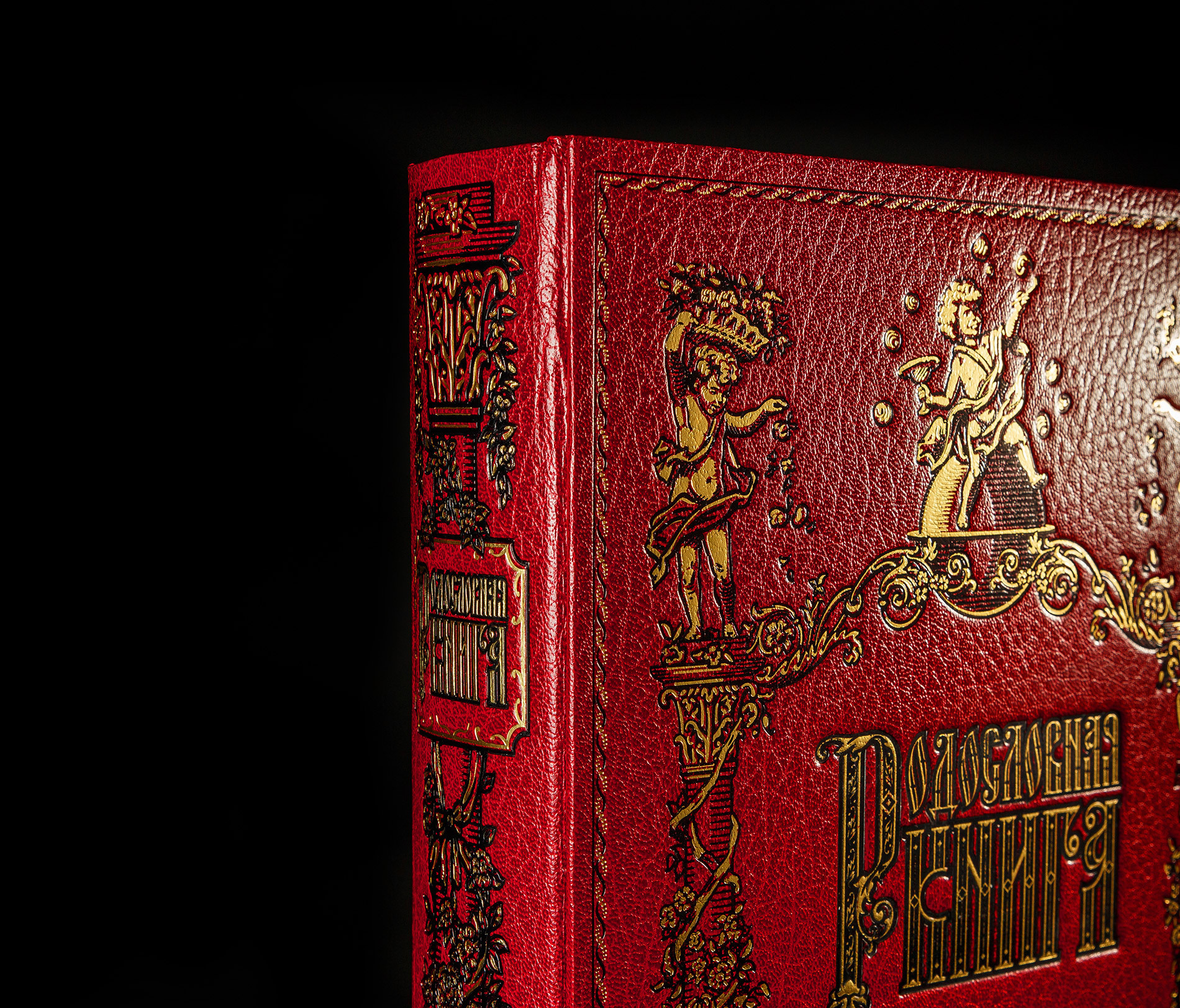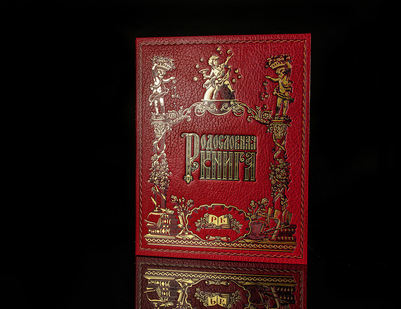 Особое внимание дизайнерами было уделено оформлению обложки родословной книги, ведь это ее лицо. От того, насколько привлекательной окажется обложка, зависит желание окружающих и самого одариваемого полистать предмет своего творения. Книга представлена в благородном бордовом цвете, а все, что изображено на обложке, сделано с помощью золотого и черного тиснений. Купидон как символ любви здесь выбран главным героем. В окружении ангелов он охраняет семью от несчастий и невзгод. Поражает детальное оформление этого сюжета: растительный рисунок, величественные колонны, книги, свитки, — все здесь имеет значение и говорит об основательности, прочности семейных уз, важности хранения памяти о предках и почитании их заслуг. Одариваемый будет рассматривать каждый штрих и находить новые символы, вдохновляться этим и писать историю своего рода.