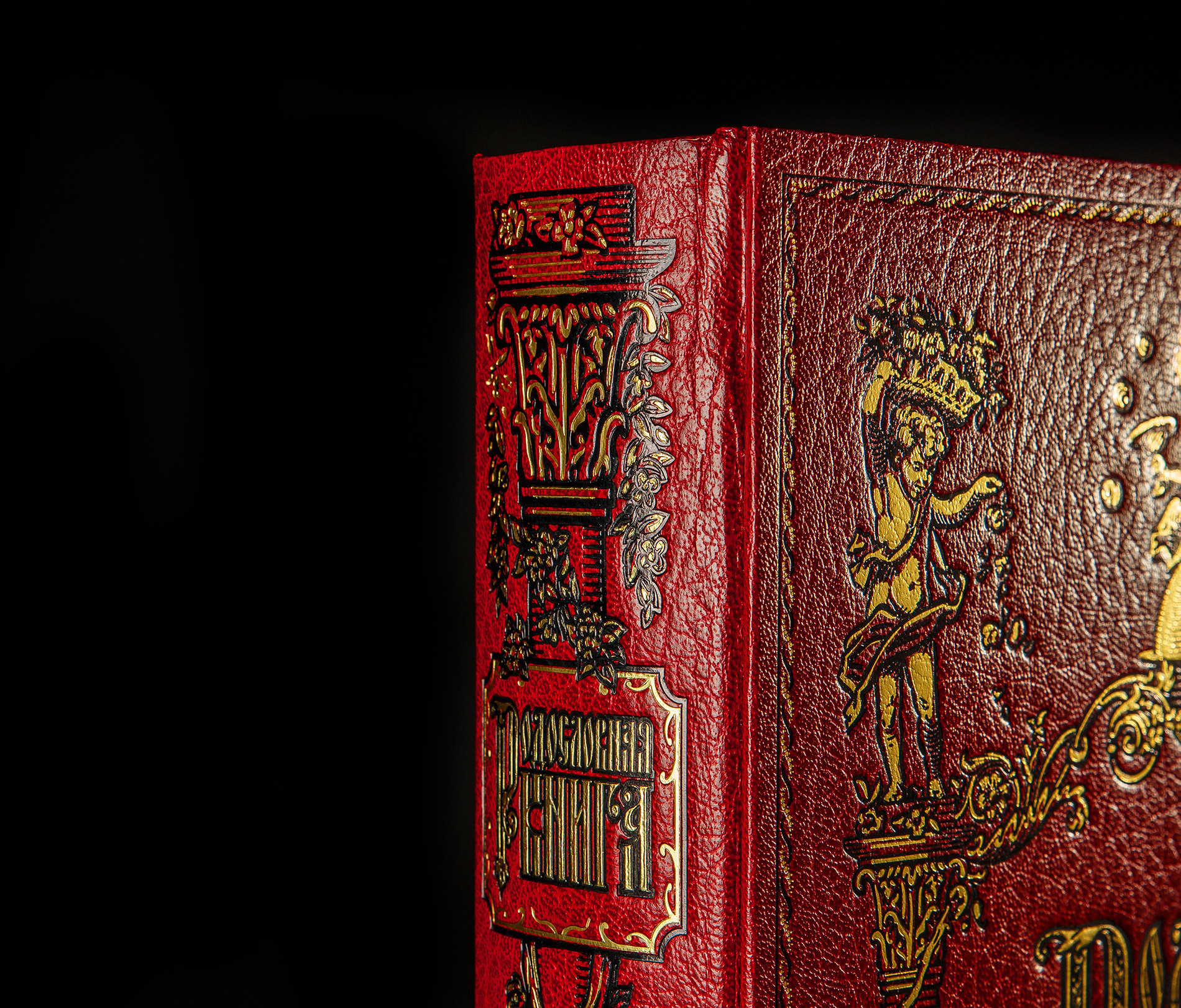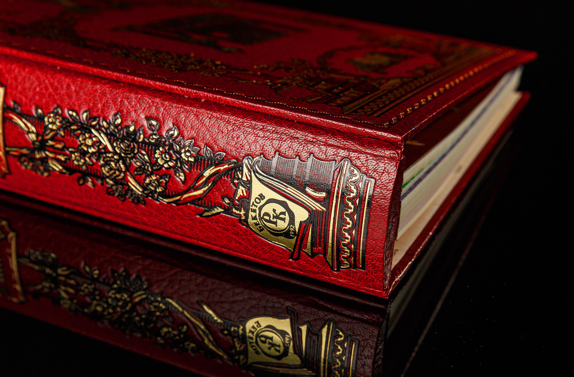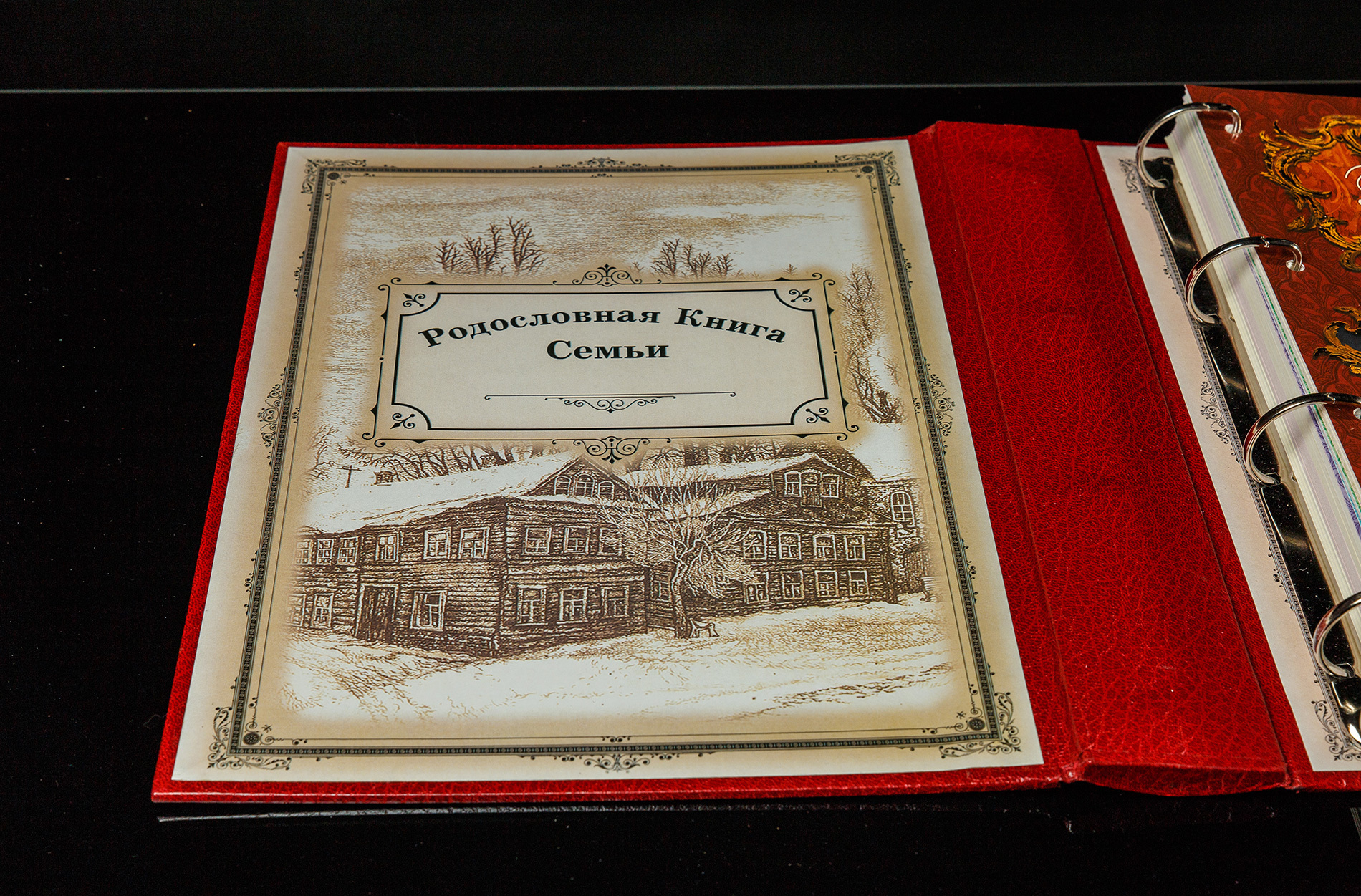 Особое внимание дизайнерами было уделено оформлению обложки родословной книги, ведь это ее лицо. От того, насколько привлекательной окажется обложка, зависит желание окружающих и самого одариваемого полистать предмет своего творения. Книга представлена в благородном бордовом цвете, а все, что изображено на обложке, сделано с помощью золотого и черного тиснений. Купидон как символ любви здесь выбран главным героем. В окружении ангелов он охраняет семью от несчастий и невзгод. Поражает детальное оформление этого сюжета: растительный рисунок, величественные колонны, книги, свитки, — все здесь имеет значение и говорит об основательности, прочности семейных уз, важности хранения памяти о предках и почитании их заслуг. Одариваемый будет рассматривать каждый штрих и находить новые символы, вдохновляться этим и писать историю своего рода.