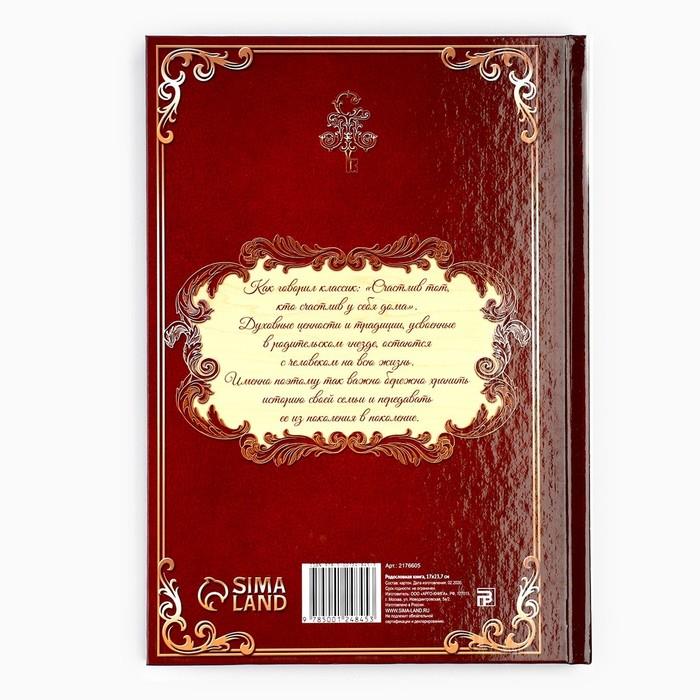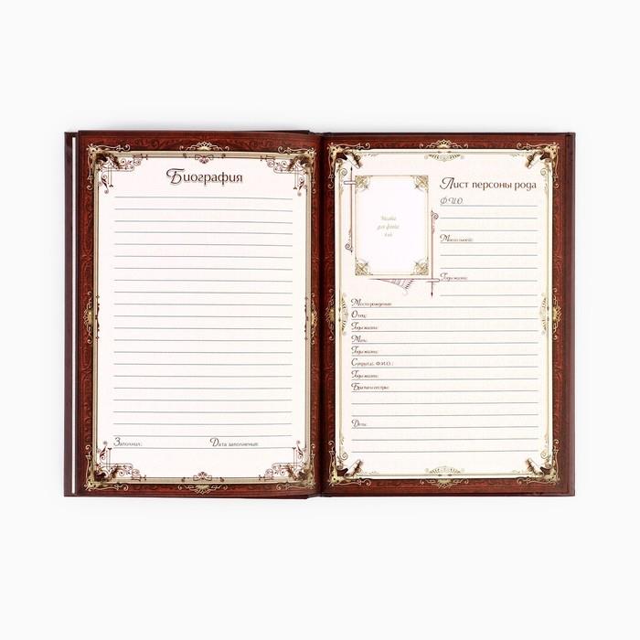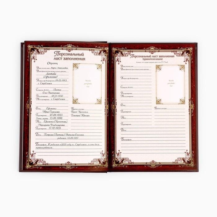 | Комплектация | - рекомендации по заполнению; - словарь терминов родства; - рекомендации по заполнению древа; - персональные листы; Тематические разделители: - «Род отца»; - «Род матери»; - «Род отца по линии супруга (супруги)»; - «Род матери по линии супруга (супруги)»; - «Мой род в ВОВ»; - «Друзья семьи»; - «Свадьбы нашего рода»; - «Путешествия нашего рода»; - «Награды и отличия нашего рода»; - «Домашние питомцы»; - «Традиции нашего рода».; - история фамилий; - календарь семейных дат; - послание потомкам. |