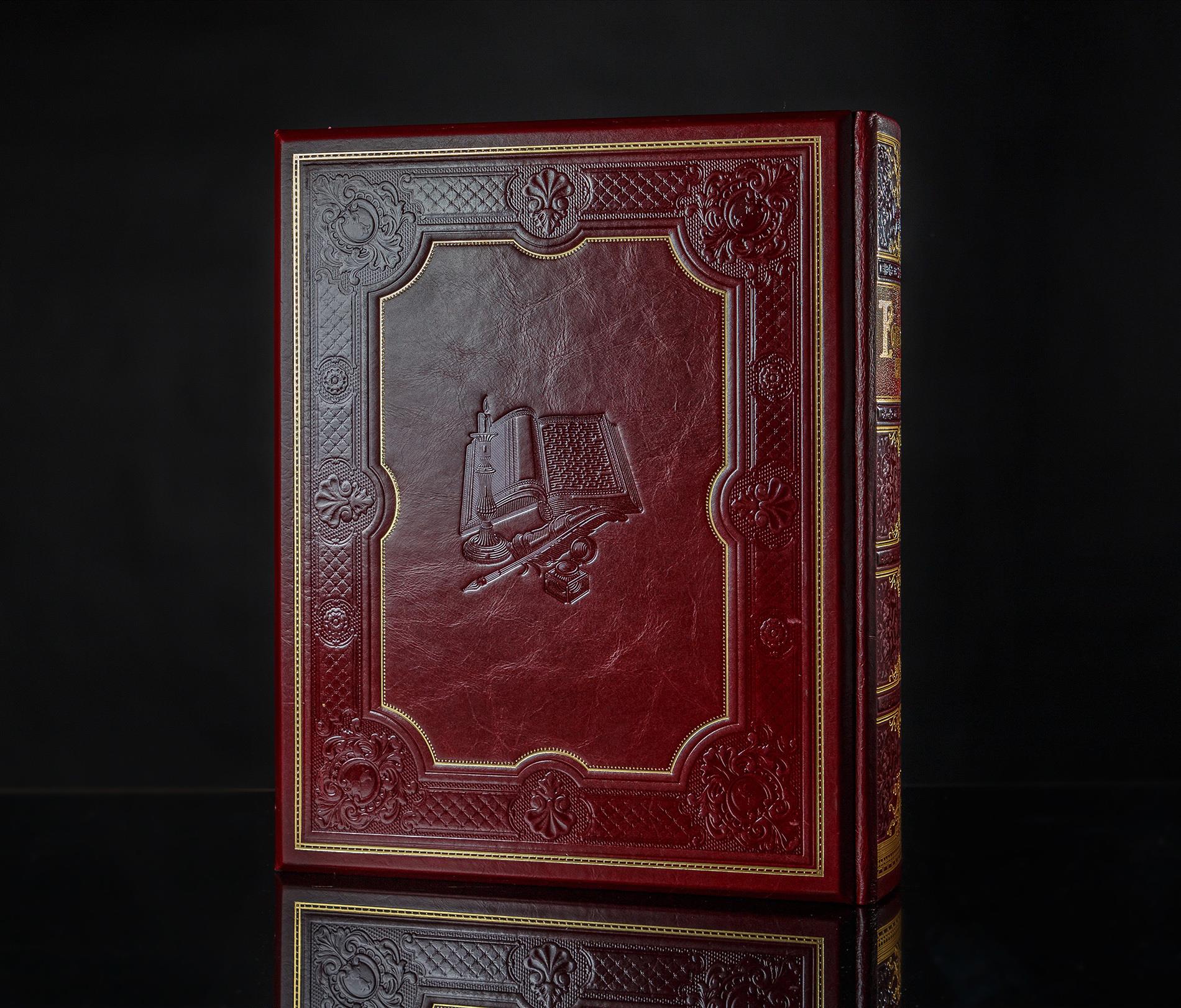 Обложка книги выполнена искусными мастерами по старинной французской технологии с использованием блинтового, конгревного и «золотого» тиснений. Широкая резная рамка с витиеватыми уголками и барельеф в центре обложки с изображением летописца говорят о важности информации, которая вот-вот откроется читателю. Насыщенный бордовый цвет кожаной обложки выглядит совершенно роскошно и благородно. Ее торжественность и нарядность весьма важны, поскольку прикоснуться к такой красивой книге — это довольно волнительный момент, так же как прикоснуться к истории рода одариваемого.