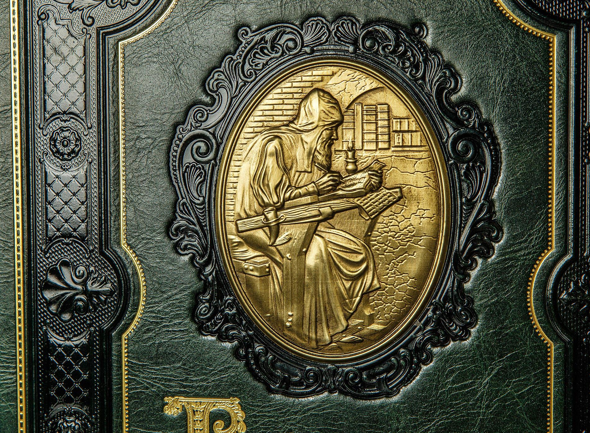 Обложка книги выполнена искусными мастерами по старинной французской технологии с использованием блинтового, конгревного и «золотого» тиснений. В цвете золота выполнен портрет летописца, который занимает центральное место обложки. Возможно, это Нестор — монах Киево-Печерского монастыря, живший во второй половине XI — начале XII вв, пишет историю событий тех лет. Насыщенный темно-зеленый цвет кожаной обложки благороден, не раздражает глаз и уместен, учитывая важность содержания книги. Приятно прикоснуться руками к такому шедевру.