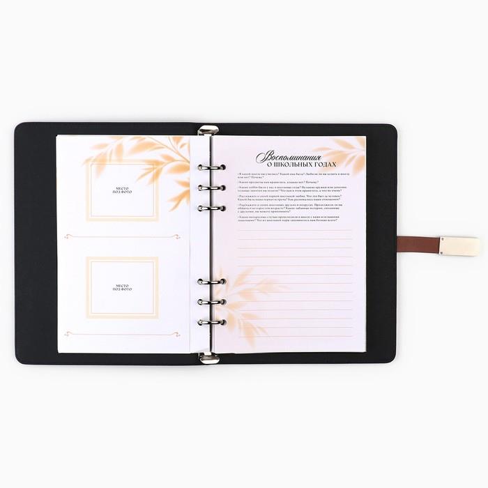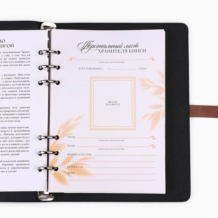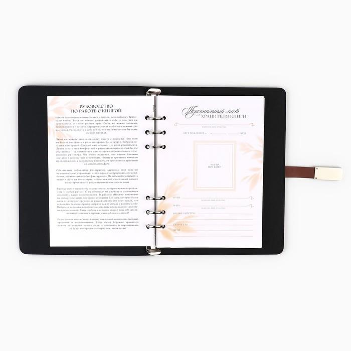 | Комплектация | - воспоминания о профессиональной деятельности; - персональный лист хранителя книги; - биография хранителя книги; - воспоминания о школьных годах; - раздел Наши дети; - история знакомства; - традиции и секреты моей семьи; - пример для заполнения; - биография хранителя книги; - прошлое - фундамент настоящего; - раздел «Супруг(-а) хранителя книги»; - послание потомкам; - встроенная флешка на 16 гб.