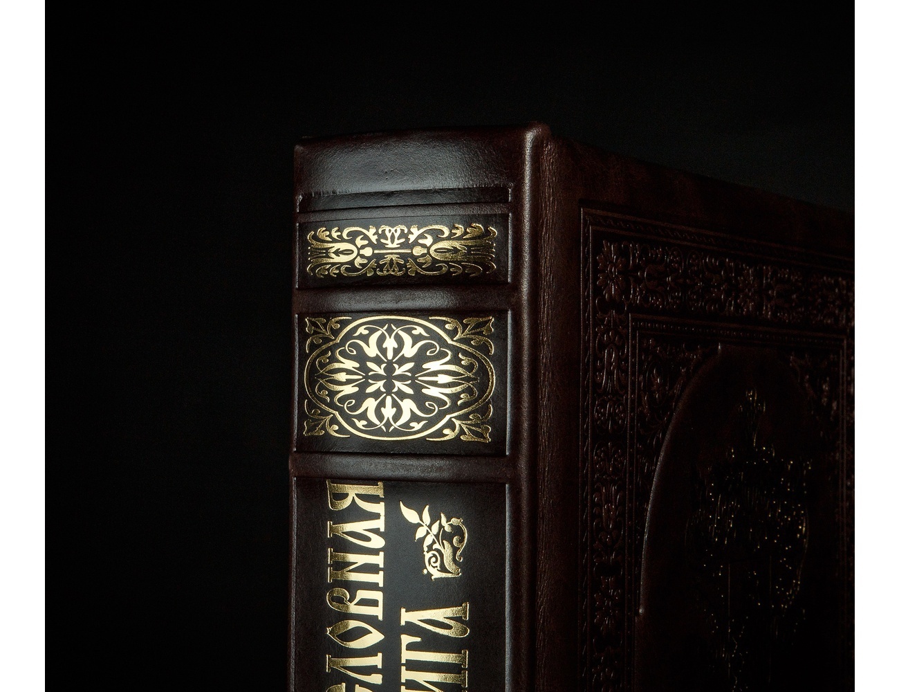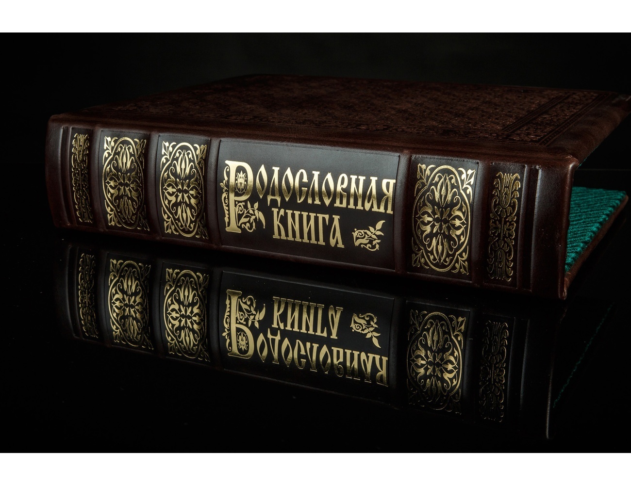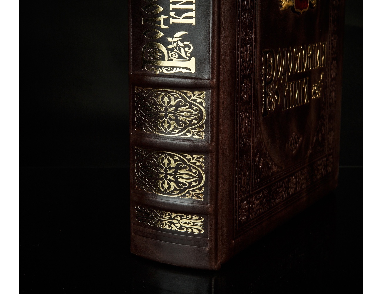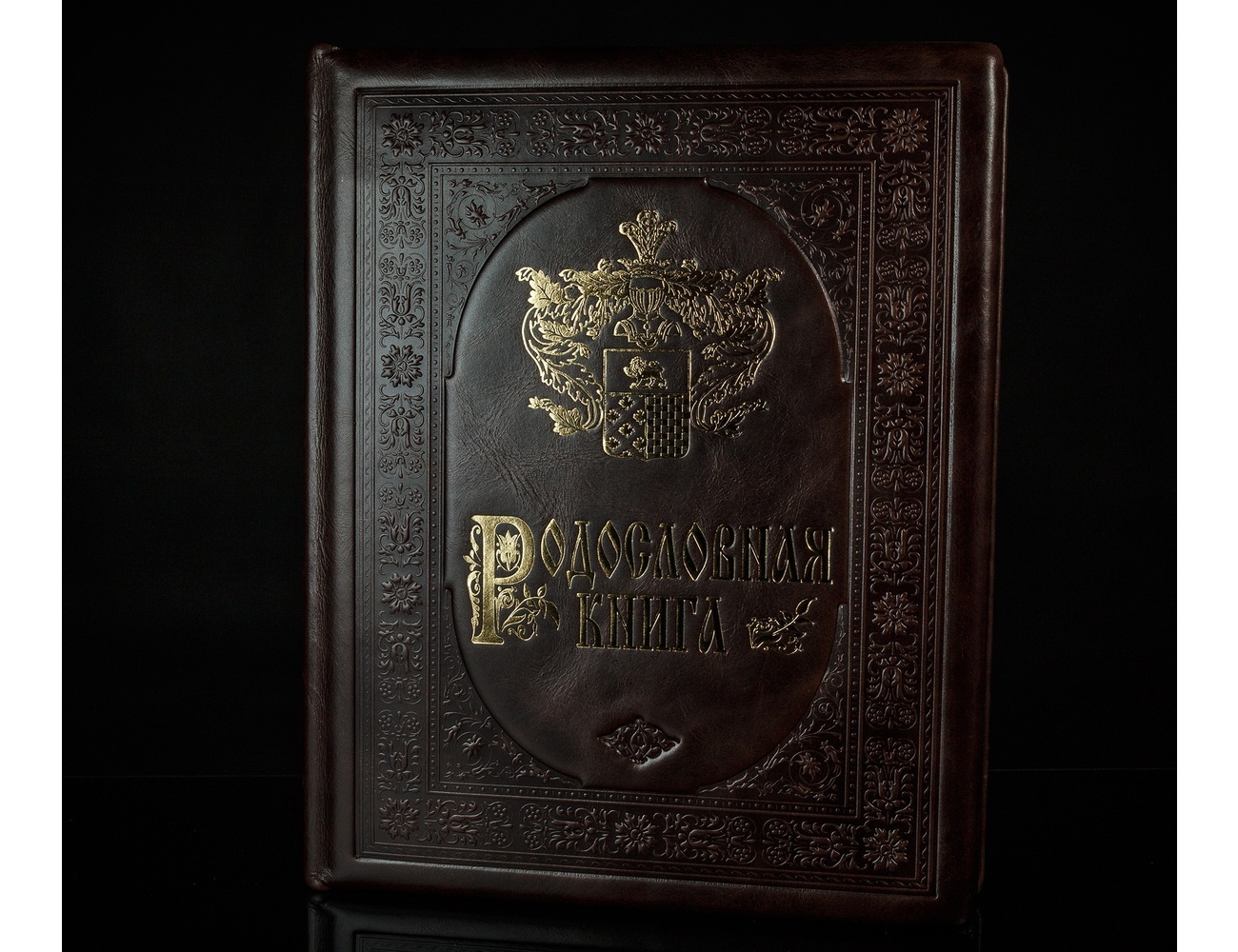 Родословная книга «Золотая серия» представляет собой роскошный фолиант, над которым славно потрудился целый коллектив опытных специалистов редких профессий. Для изготовления ее переплета были использованы пластины прочного и легкого МДФ, снаружи вручную отделанные натуральной телячьей кожей отменного качества. Поверхность кожи облагорожена эффектным тиснением, образующим изящный растительный орнамент и эстетичную рамку. В центре этой рамки находится оттиснутый золотой фольгой образец дворянского геральдического герба. Такой же фольгой оттиснут узор на корешке будущей семейной реликвии.
