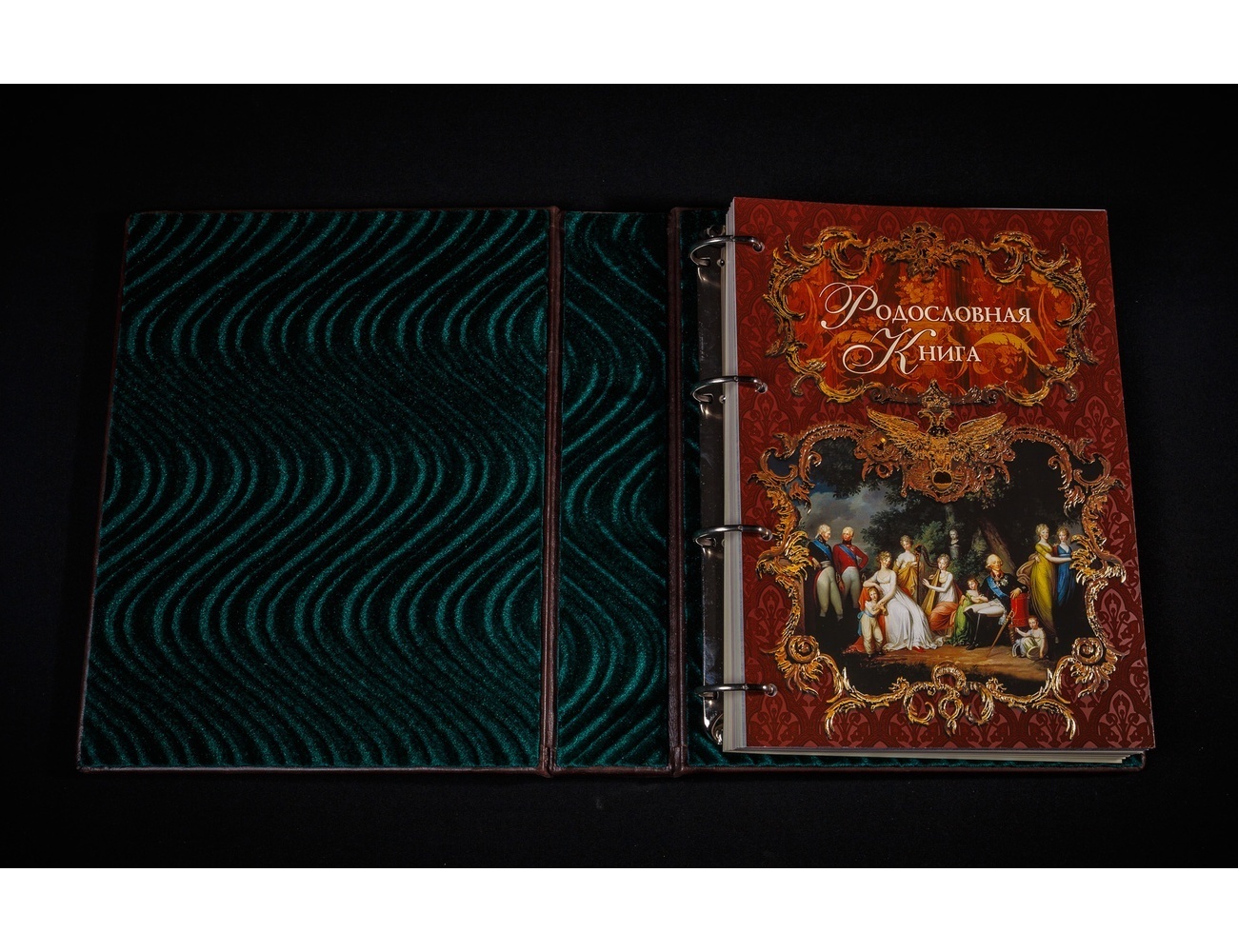 Внутренняя сторона обложки декорирована оригинальным полиграфическим покрытием зеленого цвета с нанесенным на него узором в модном стиле «свирл». Наполнением книги служат сто восемь листов, восхищающих колоритным художественным оформлением в традициях российского барокко. Для надежной их фиксации предусмотрен кольцевой механизм, устройство которого допускает любые вставки различных документов и перестановки листов.