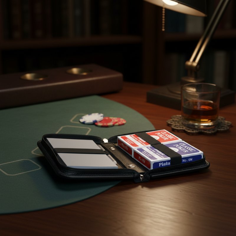 | Комплектация | - сумка из натуральной кожи; - 2 колоды карт игральных пластиковых 55 листов (для покера); - блокнот для записи партий; - карандаш; - чехол из спанбонда (нетканый мягкий материал). |