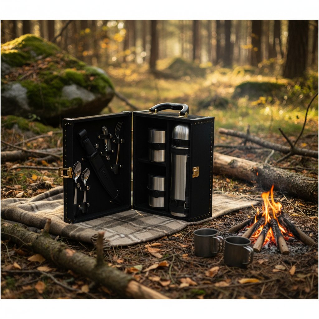| Комплектация | - кейс из ткани и натуральной кожи; - термос из нержавеющей стали, емкость 1 л.; - 2 термокружки с крышкой; - нож филейный из нержавеющей стали в ножнах с заточным устройством; - 2 вилки из нержавеющей стали; - 2 ложки из нержавеющей стали; - 2 ложки чайных из нержавеющей стали; - штопор сомелье; - чехол из спанбонда (нетканый мягкий материал). |