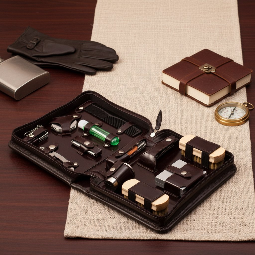 | Комплектация | - сумка из натуральной кожи; - маникюрный набор (пилка для ногтей, ножницы, кусачки); - бритвенный станок; - 2 стакана из нержавеющей стали; - щетка для обуви; - щетка для одежды; - нож складной; - зеркало складное; - зажигалка; - зубная щетка в футляре; - расческа для волос; - мультиинструмент складной; - штопор сомелье; - чехол из спанбонда (нетканый мягкий материал). |